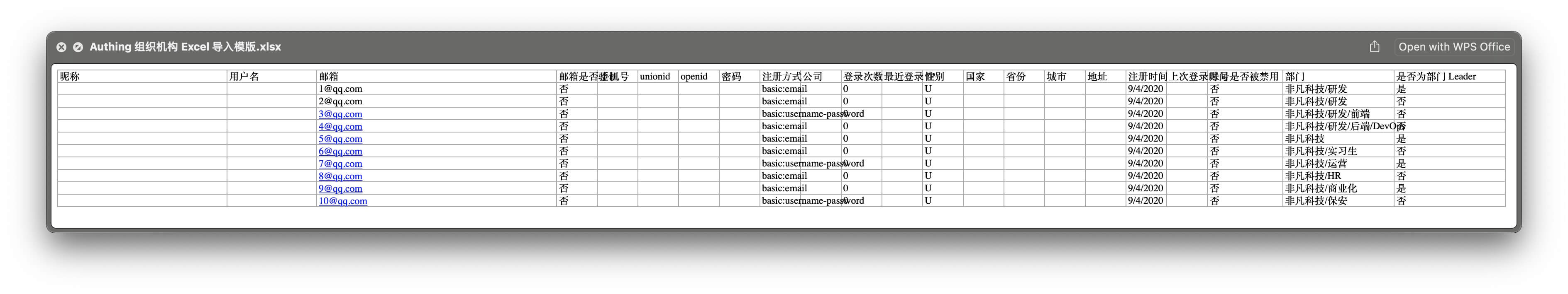 - 邮箱是否验证:用户的邮箱是否已经验证,填 “是” 或者 “否”;