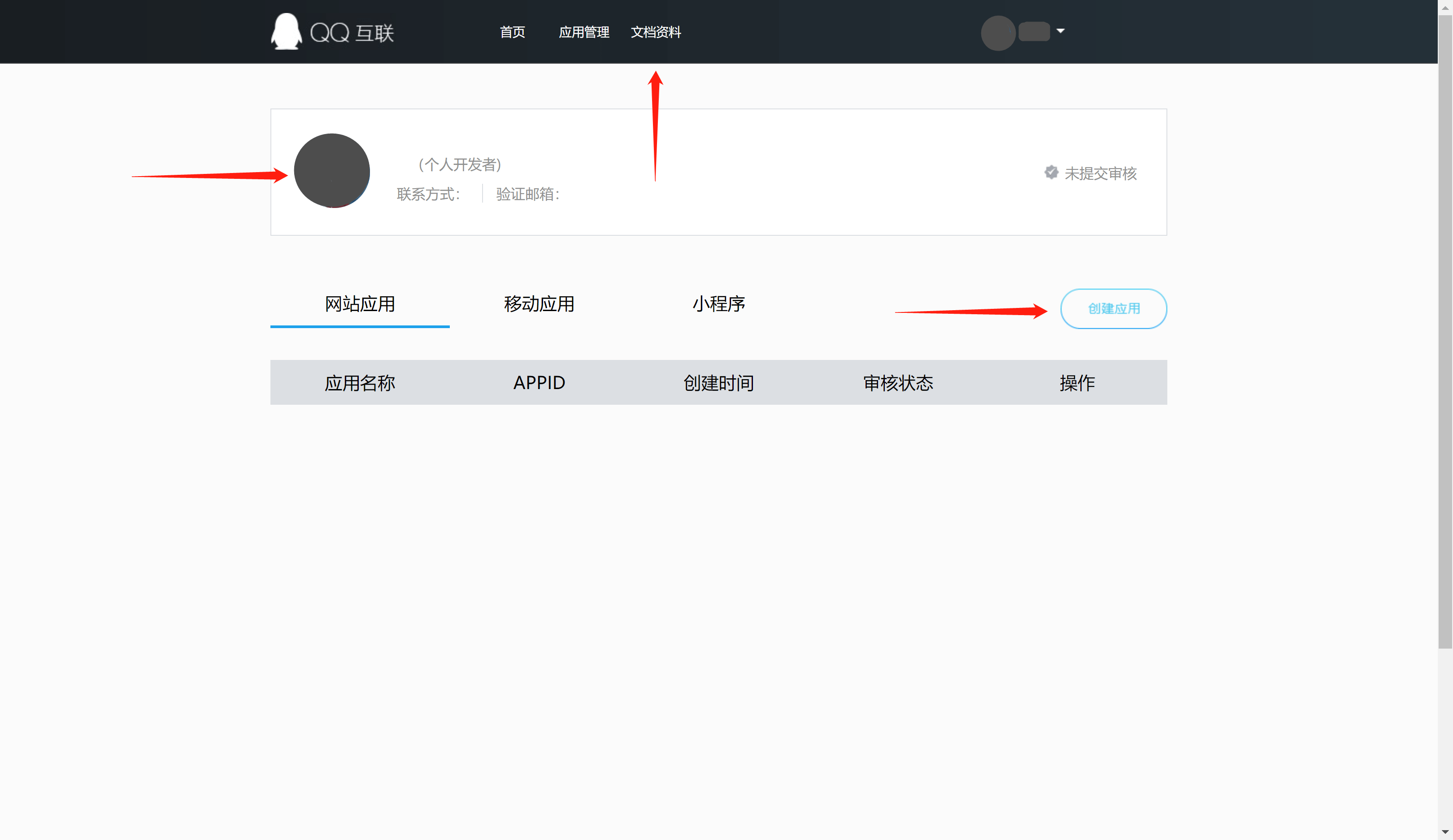 前往 QQ 互联中心 (opens new window) 创建一个网站应用: