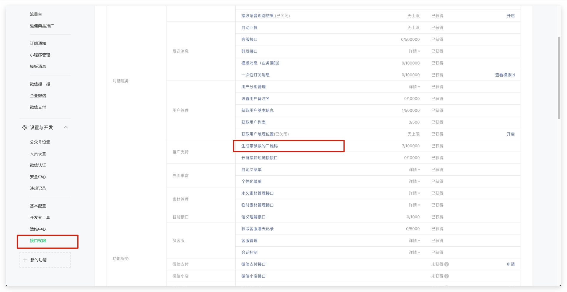 你需要在微信公众号平台的设置与开发-接口权限页面添加生成带参数的二维码 (opens new window)接口权限: