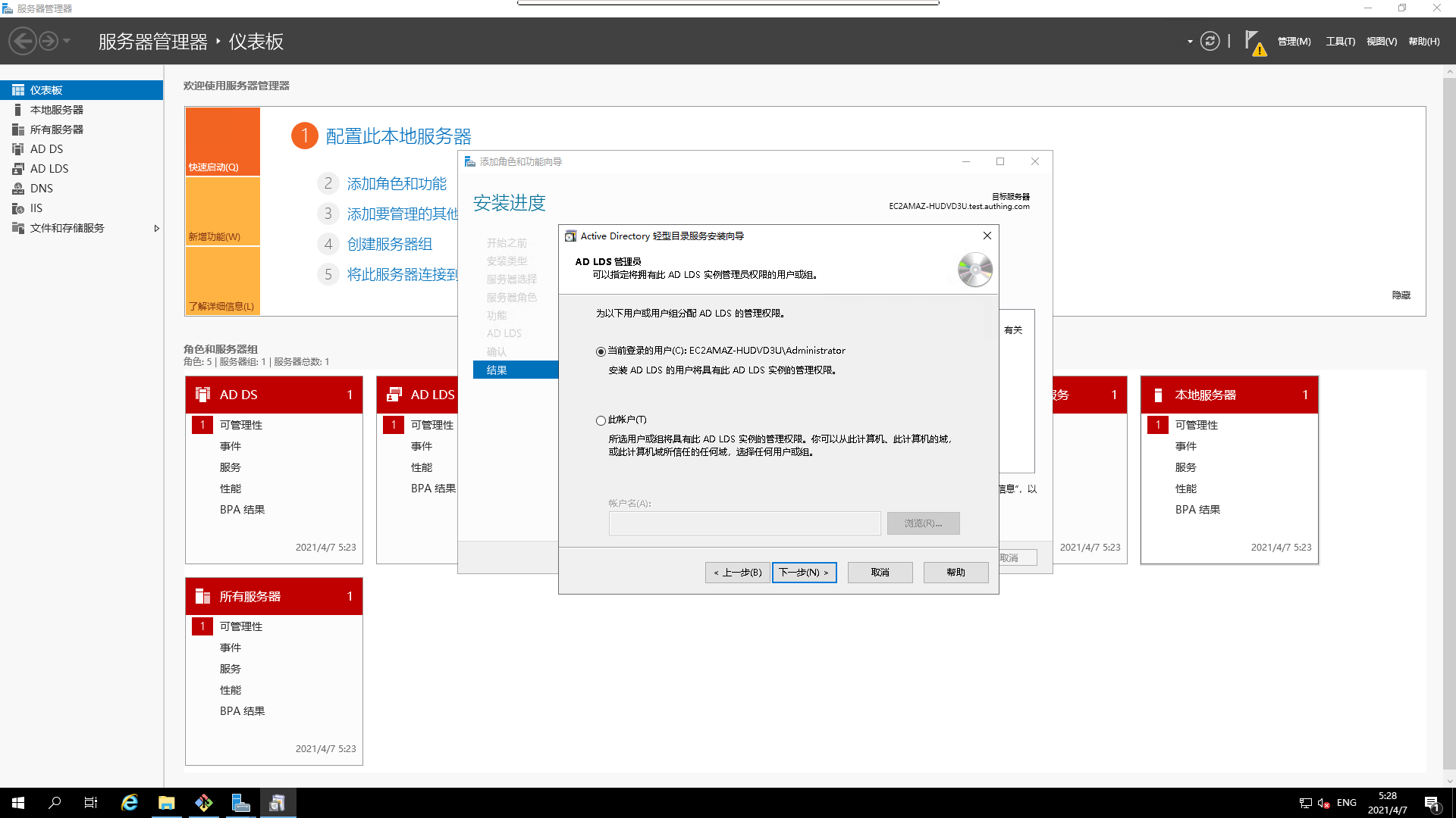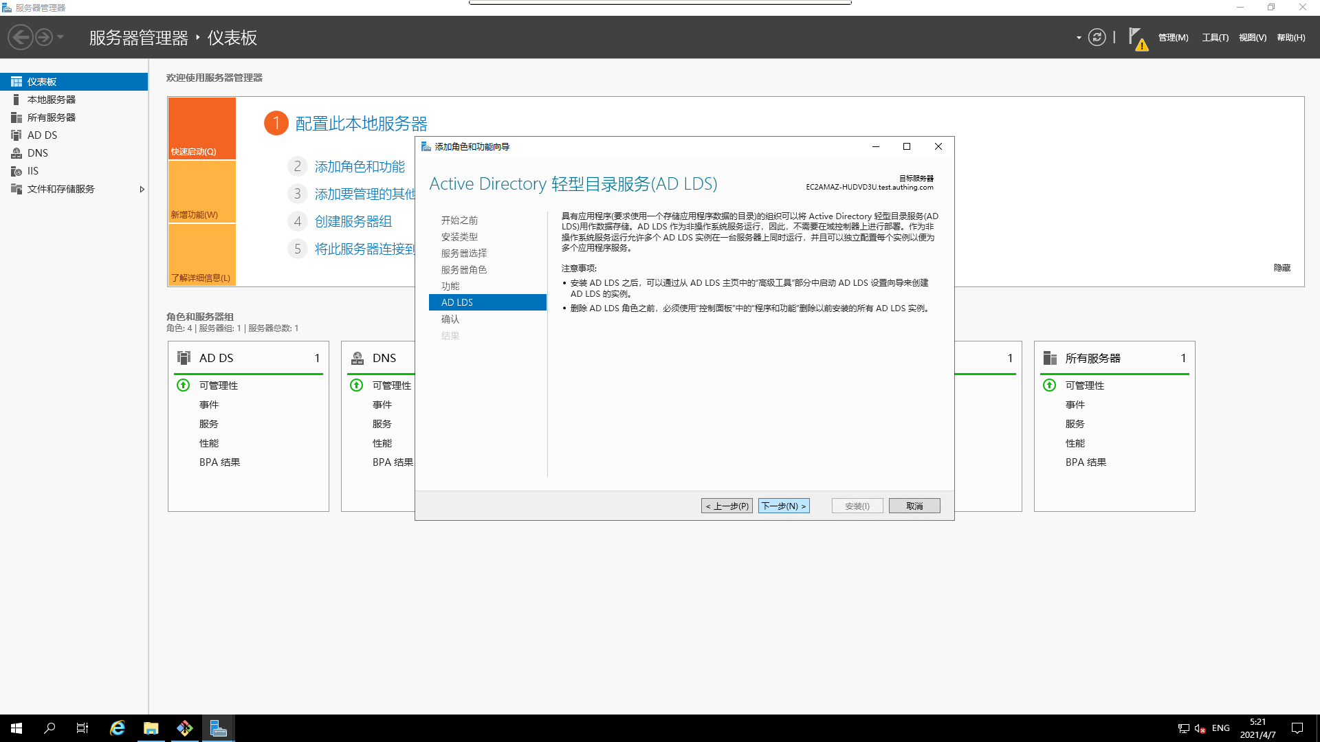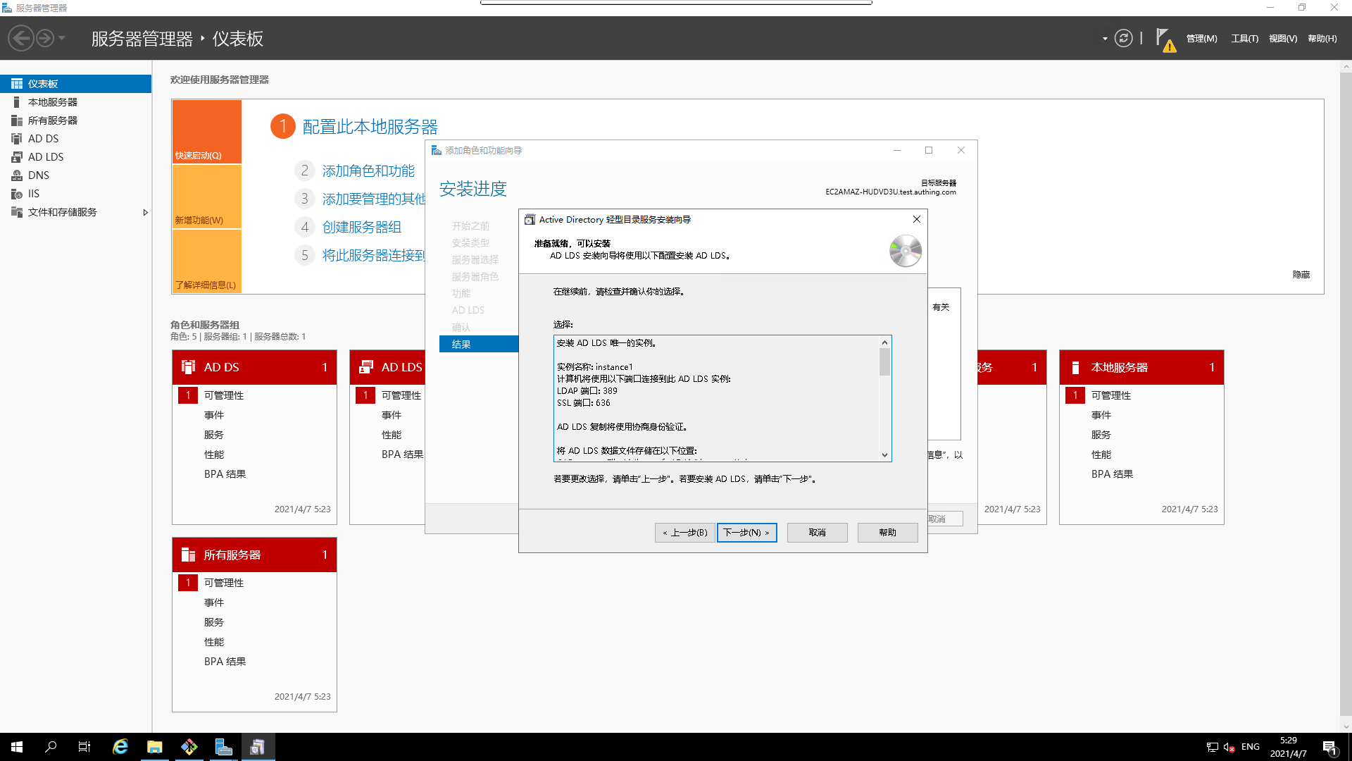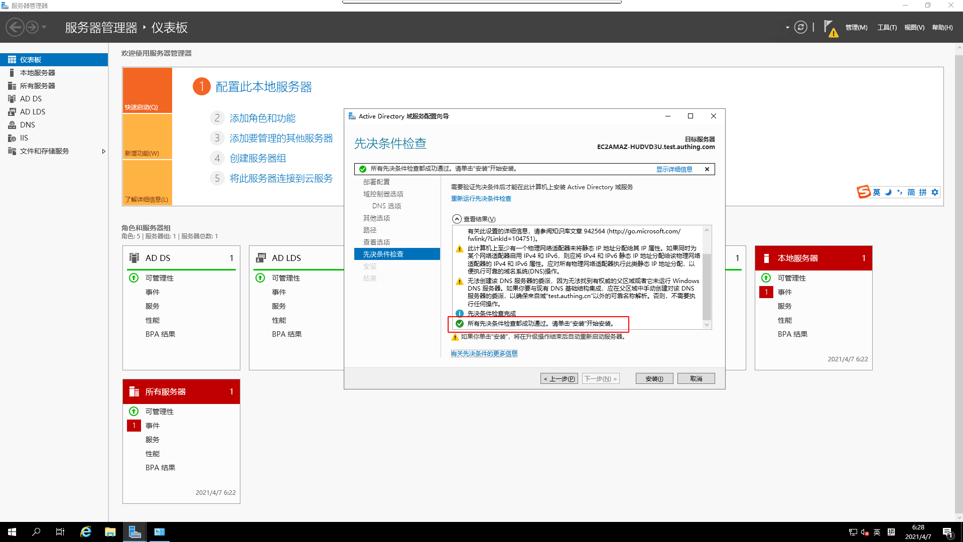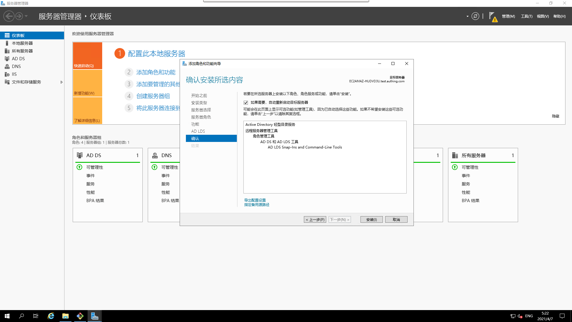 配置 AD 域服务的安装, 此处只是提供安装过程, 以及需要注意的点。