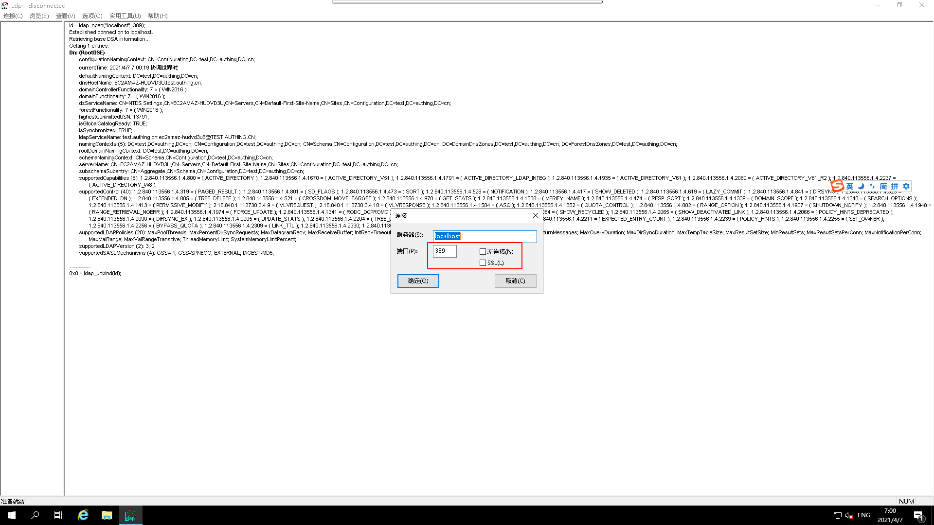 ldp进行连接测试, 无需输入更多ldap连接相关信息即可获取响应结果, 你也可以使用一些客户端(如 Apache Ldap Studio 等)来完成连接测试。当然AD 管理中心可以打开也意味着当前你的连接测试是没有问题的。