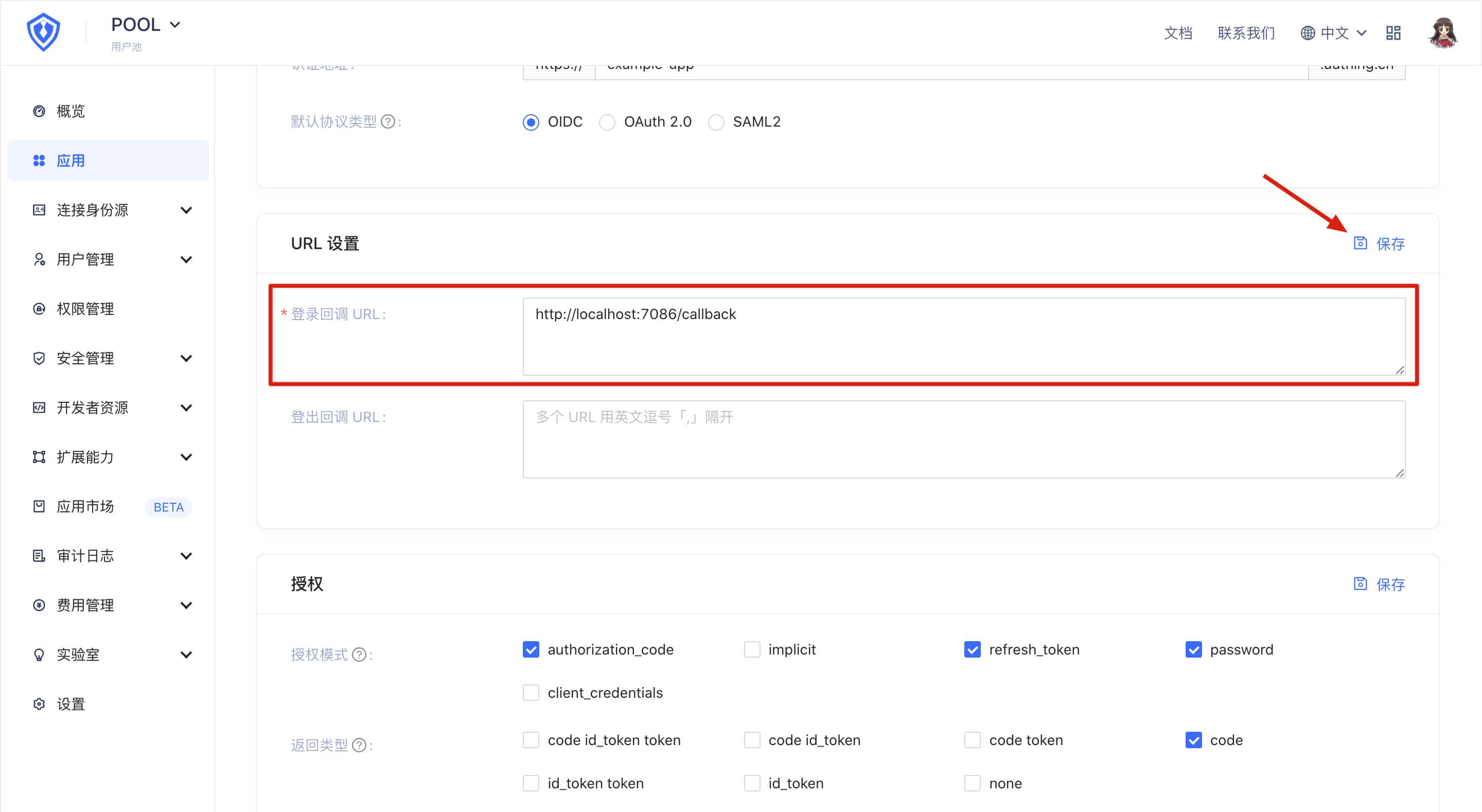 此外,还需要找到「应用配置」选项卡下的「URL 设置」面板,在「登录回调 URL」框配置一个你自己的回调地址,用来接受 Authing 发来的 Ticket 参数。如果你不知道这是什么,可以继续往下看,之后再回来配置这一项。