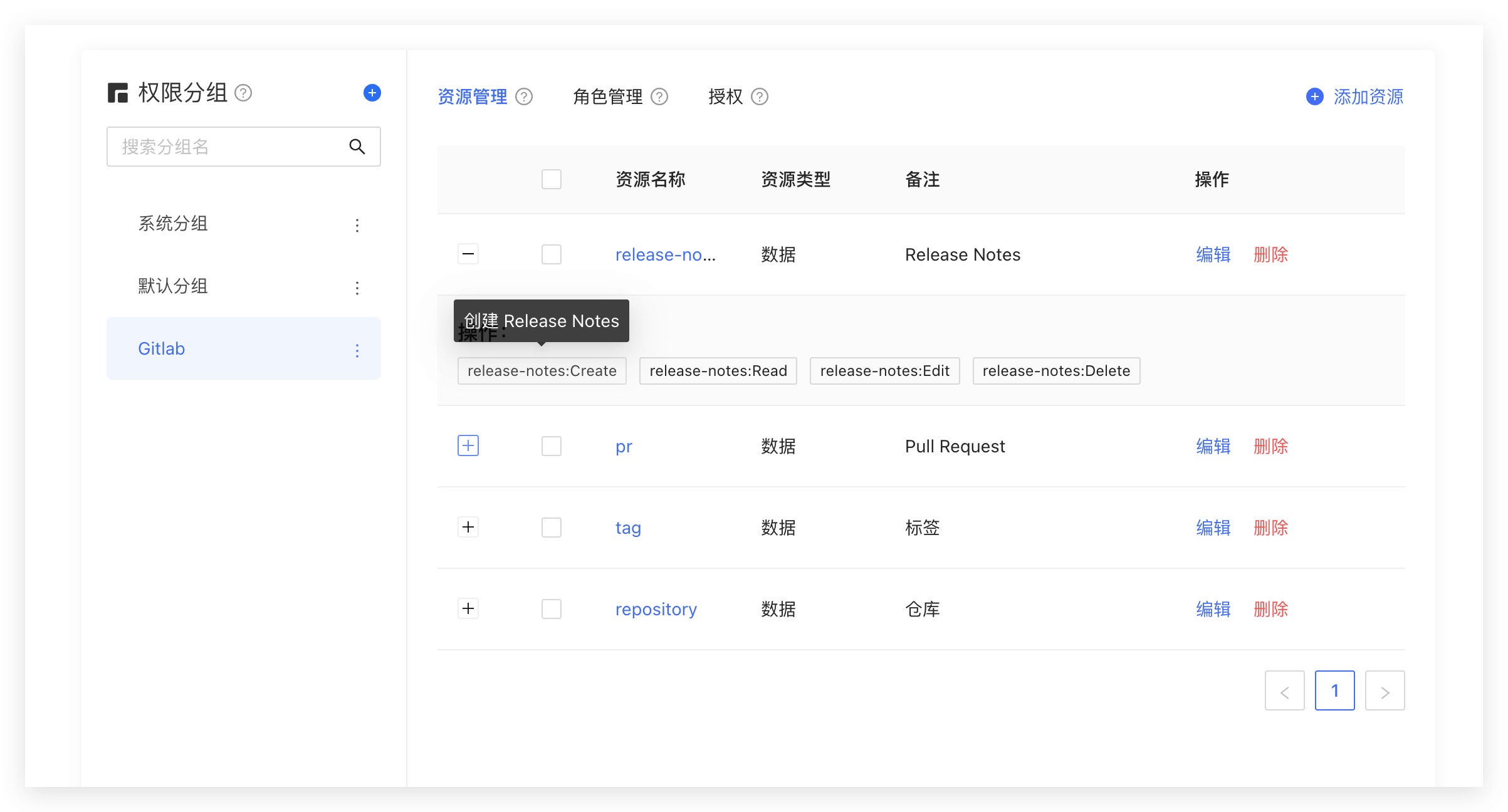 你可以把系统的一些对象抽象为资源,在这些资源上可以定义了一些操作。比如在本文的场景中,Repository、Tag、PR、Release Notes 都是资源,且这些资源都有对应的操作:
