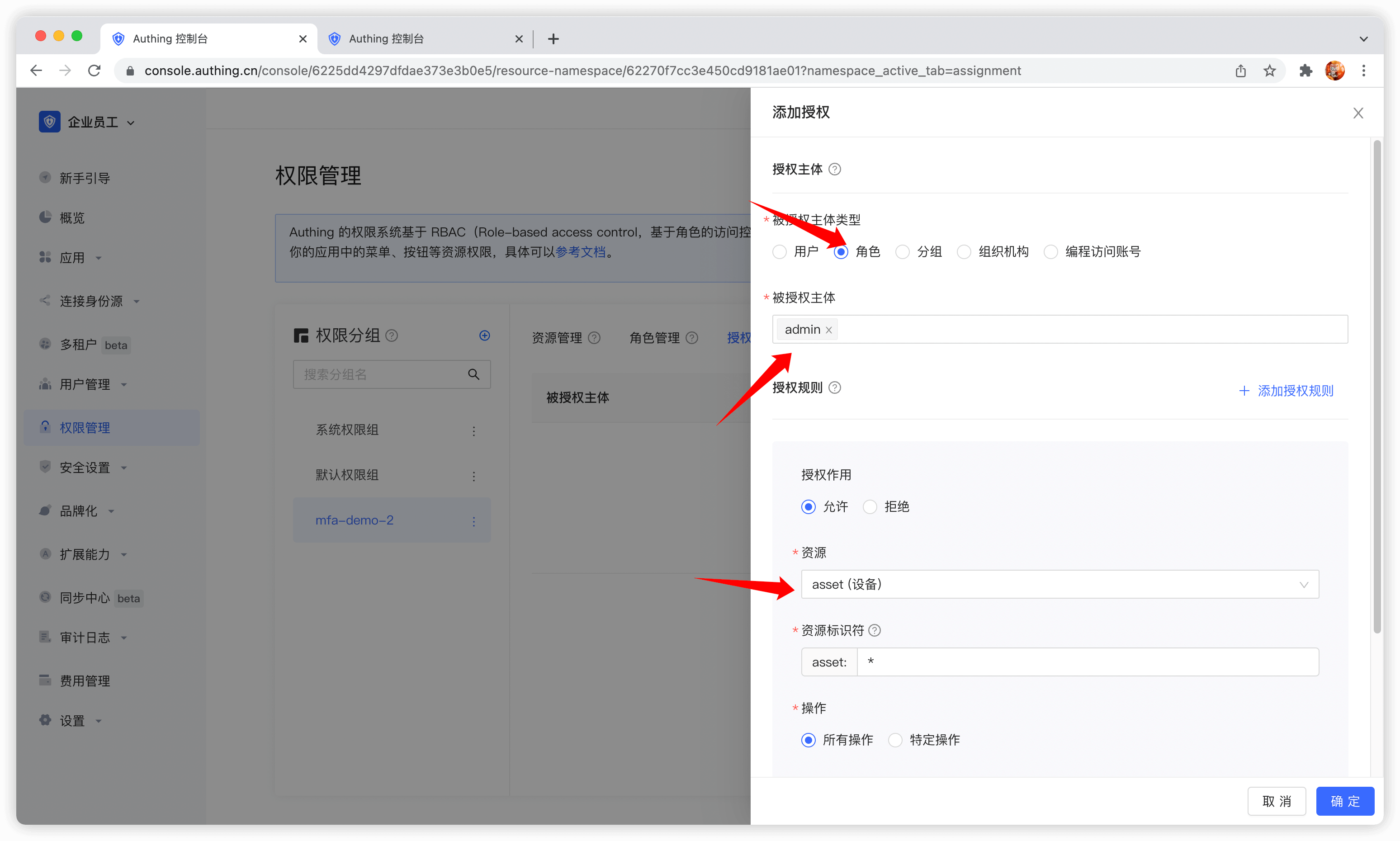 然后资源标识符填写 *,代表授权所有设备资源,操作选择特定操作,选择我们刚刚定义的资源操作中的读取设备列表操作,最后点击确定。