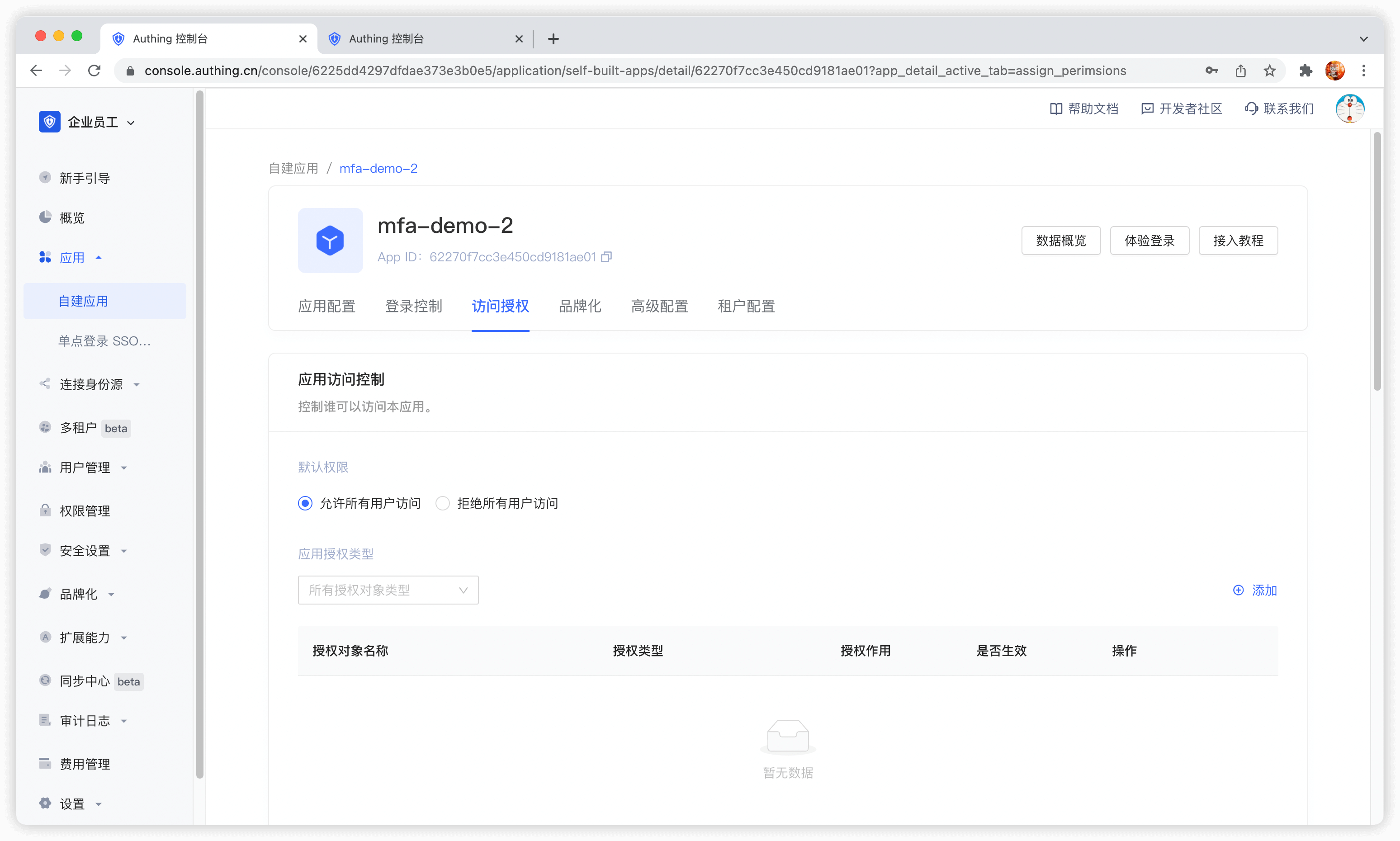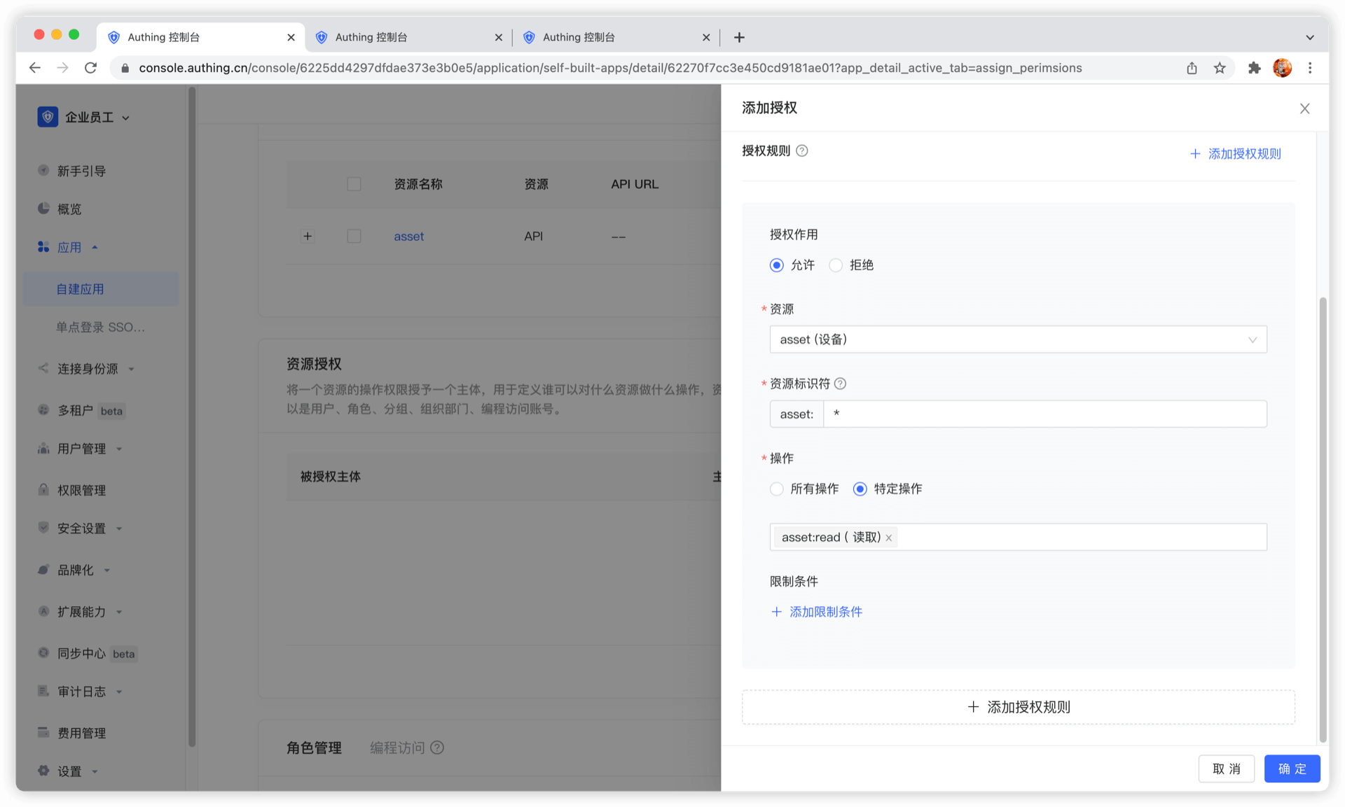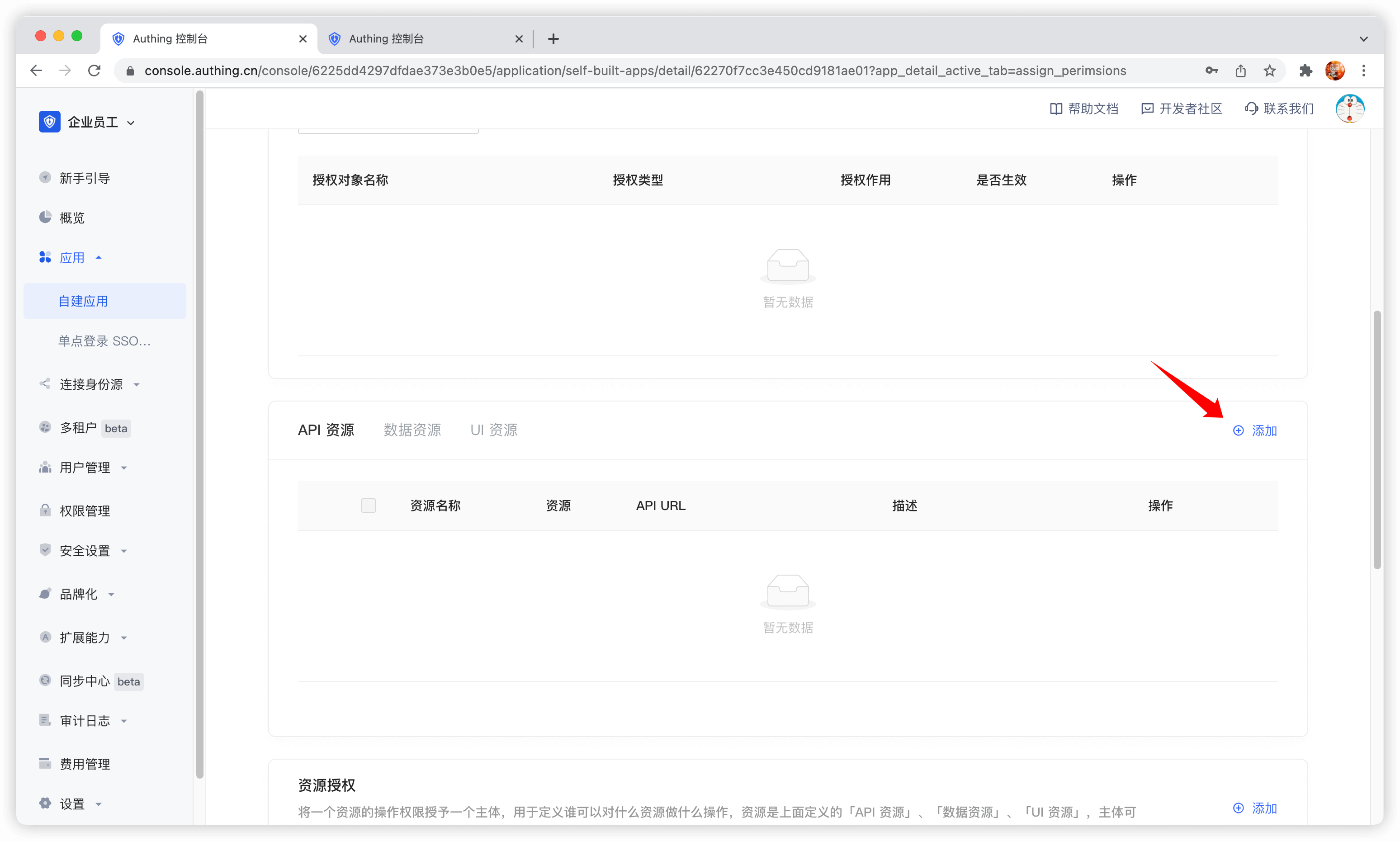 现在你有了资源和人,接下来你要定义「谁」能够对什么「资源」做什么「操作」。 在应用的资源授权卡片中,点击右侧的添加按钮。