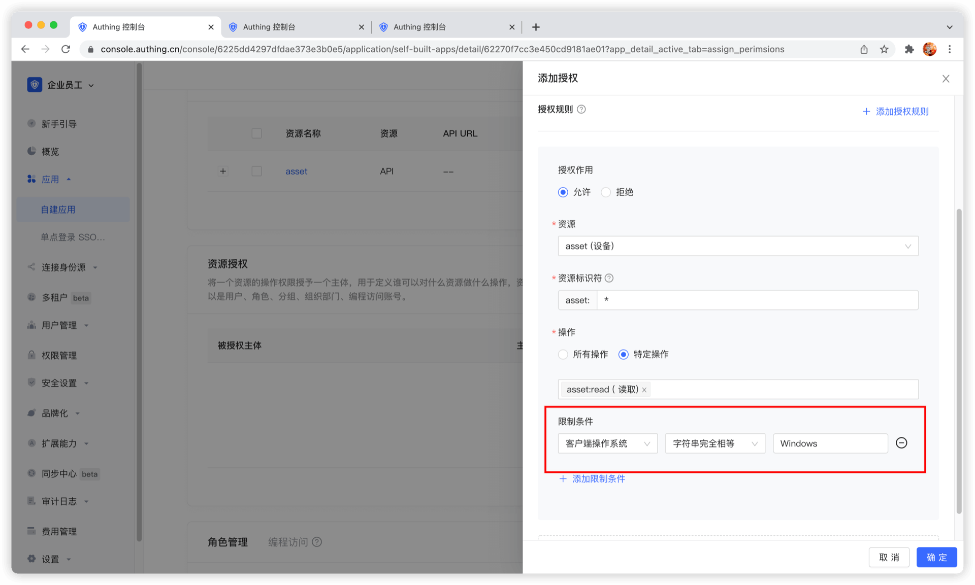 我们还可以为授权规则添加限制条件,例如该规则只针对 Windows 用户有效。如果从 Linux 机器上发起授权,Authing 会认为用户无权限,无法完成设备资源的授权。