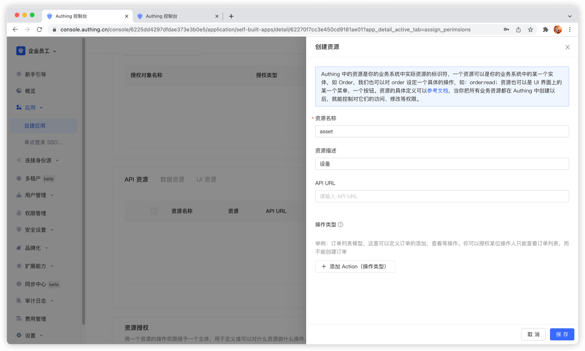 然后填写一个资源名称,建议填写语义化的资源名称,便于后续管理。在操作类型中可以定义资源操作,这里定义了读取和写入操作。最后点击保存,一个资源就创建好了。