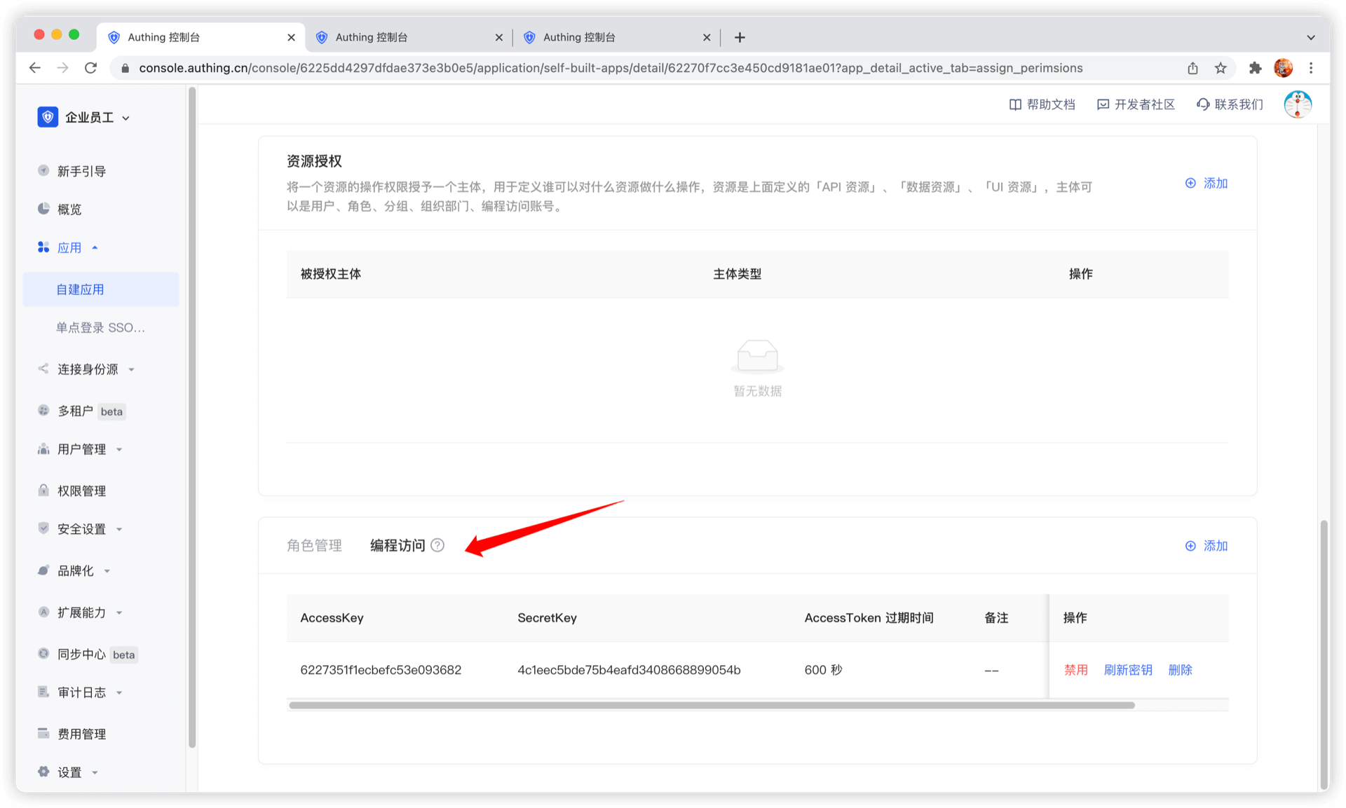 编程访问账号是应用下的一对 AccessKey、SecretKey,用于交给外包商等第三方厂商。可以使用编程访问账号结合 OIDC 授权码 code 获取用户的 AccessToken 与 IdToken,或者使用编程访问账号进行 OIDC ClientCredentials 模式代表调用方本身请求授权。