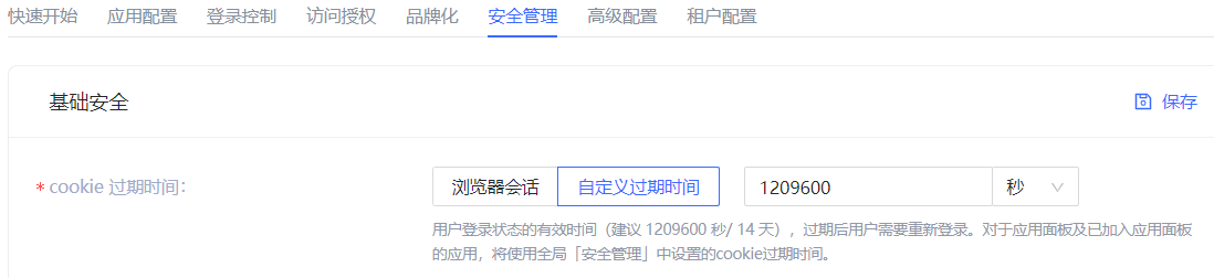 | 自定义过期时间 | 可在右侧输入框指定过期时间,建议 1209600 秒(14 天),过期后用户需要重新登录。 注意:对于应用面板及已加入应用面板的应用,将使用全局 安全管理 中设置的 cookie 过期时间。 |