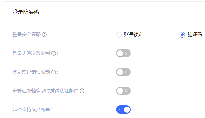 | 登录密码错误限制 | 当用户登录输入密码错误时,会按照登录安全策略规则触发相对应的策略。开启 登录密码错误限制 开关,可以通过指定 限定周期时间 和周期内限定频次 限制同一账号在多少秒内不能超过多少次密码输入错误。若在规定时间内超过次数后,该用户再次登录时,需要输入图形验证码。 |