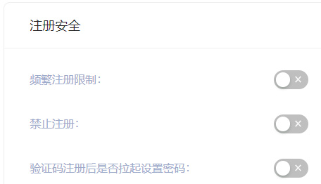 | 频繁注册限制 | 管理员可以通过指定 限定周期时间 和 周期内限定频次 限制同一个 IP 在多少秒内不能超过多少次注册。 |