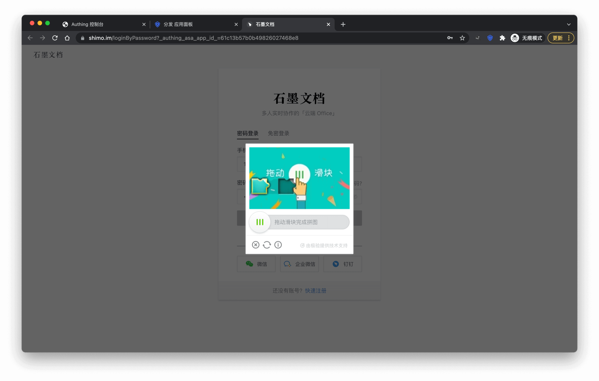 进入对应应用的登录界面,Authing 浏览器插件将会自动填充之前分配的账号密码并自动登录。有时应用需要进行一些人机校验,此行为需要用户手动操作,插件无法跳过。