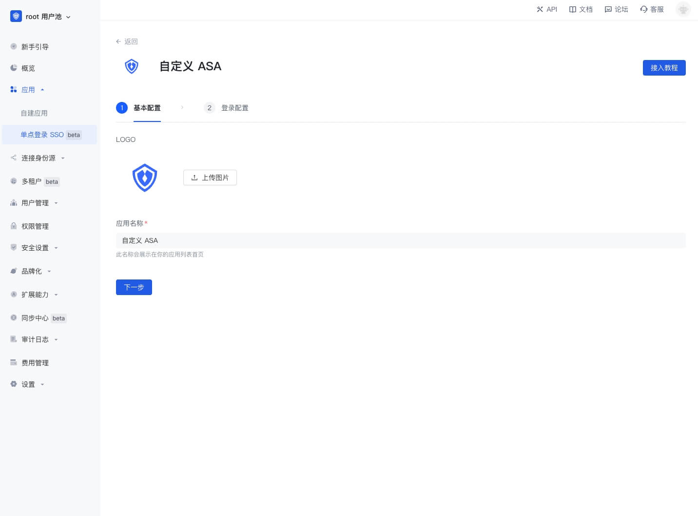 点击进入详情,然后点击「获取应用」,进入应用配置界面,上传应用 logo,填写应用名称,点击「下一步」。