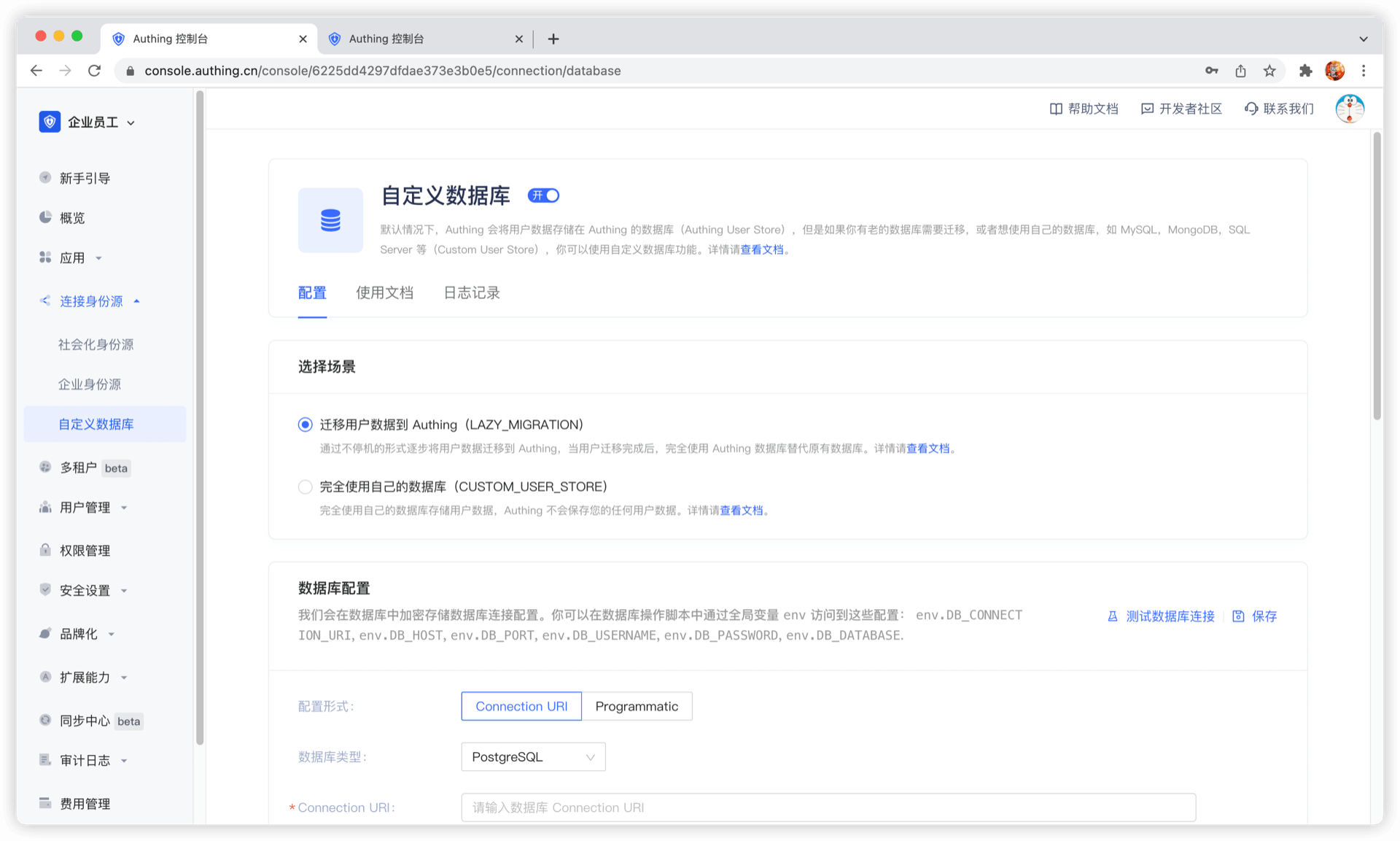 你可以通过以下方式配置自定义数据库:前往 Authing 控制台 (opens new window) 的 连接身份源 - 自定义数据库 页面开启自定义数据库连接,详情请见使用自定义数据库。