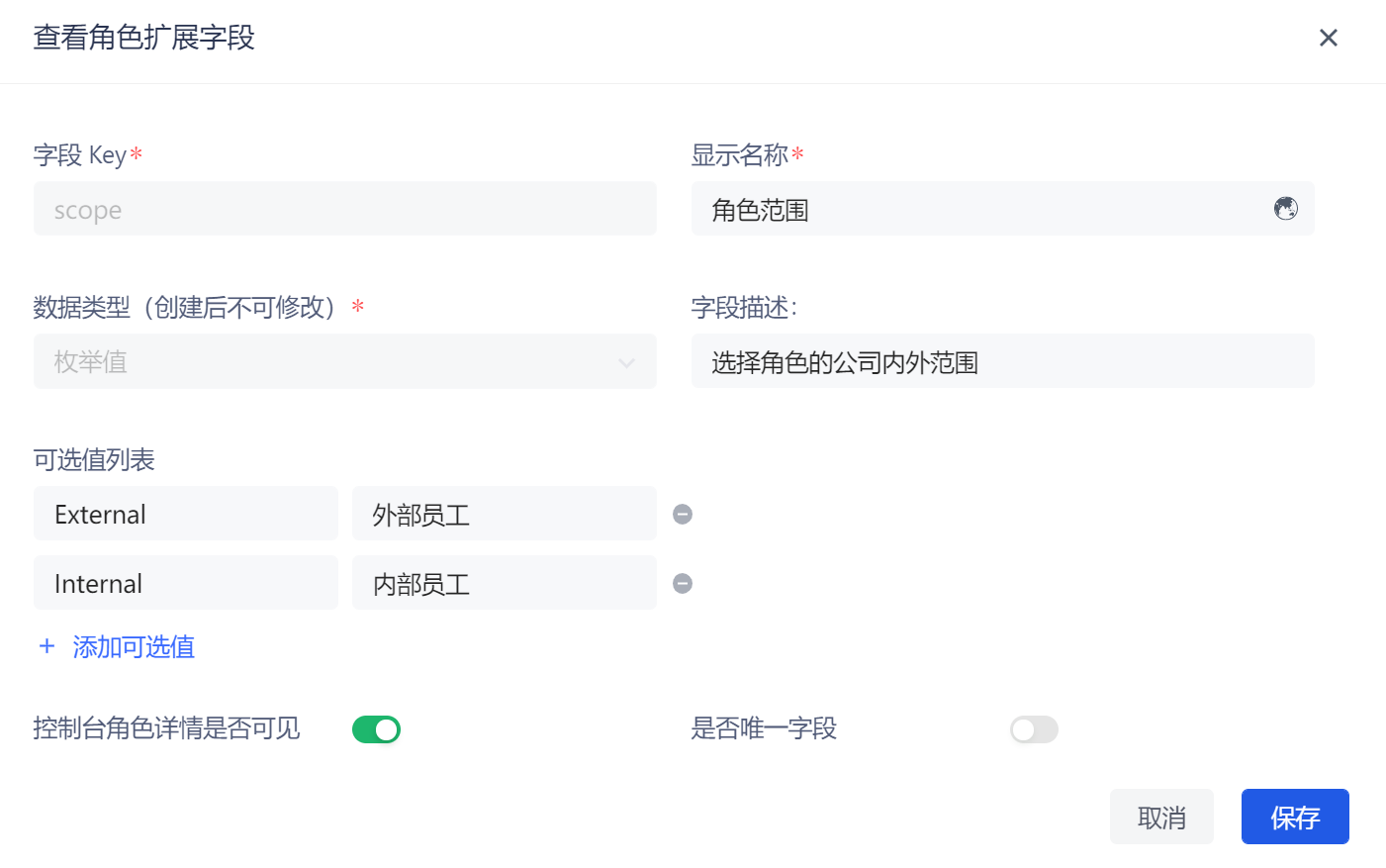点击 添加 按钮添加角色扩展字段。