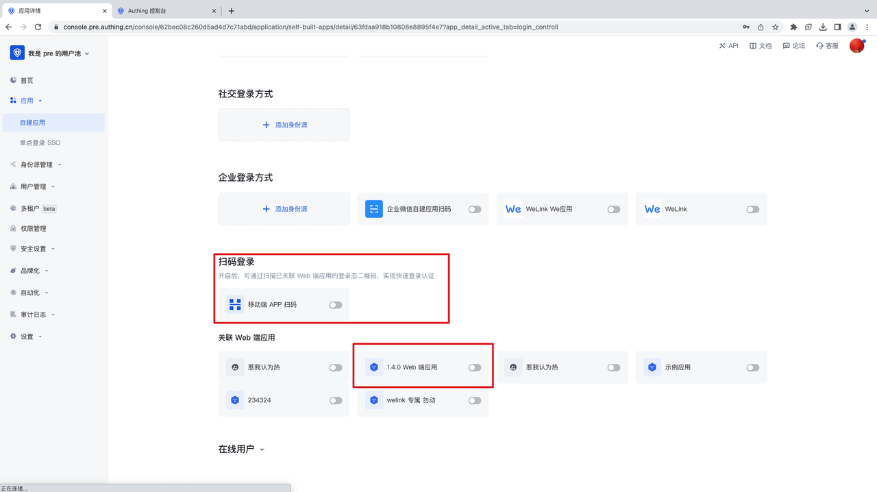 步骤 1 : 打开刚刚创建好的客户端应用,开启 移动端 APP 扫码的登录方式及相关联的应用;