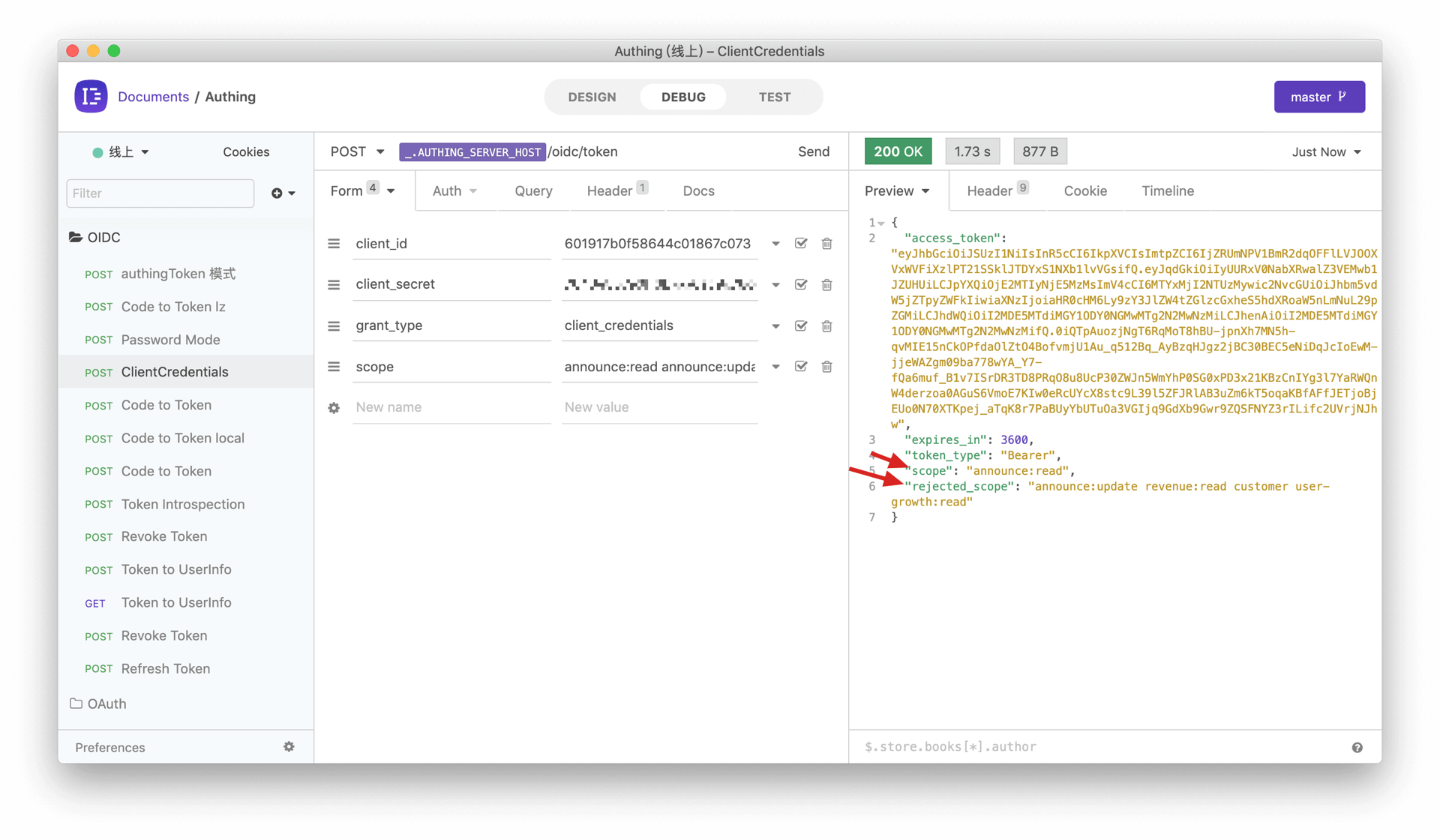 我们只将公告信息的读取权限授权给了 A 外包公司,如果 A 外包公司请求授权时,携带了其他 scope,例如:announce:read announce:update revenue:read customer user-growth:read 。Authing 会拒绝掉除了 announce:read 的所有权限。以下是 A 外包公司请求授权时的返回结果。被拒绝的权限在 rejected_scope 中。