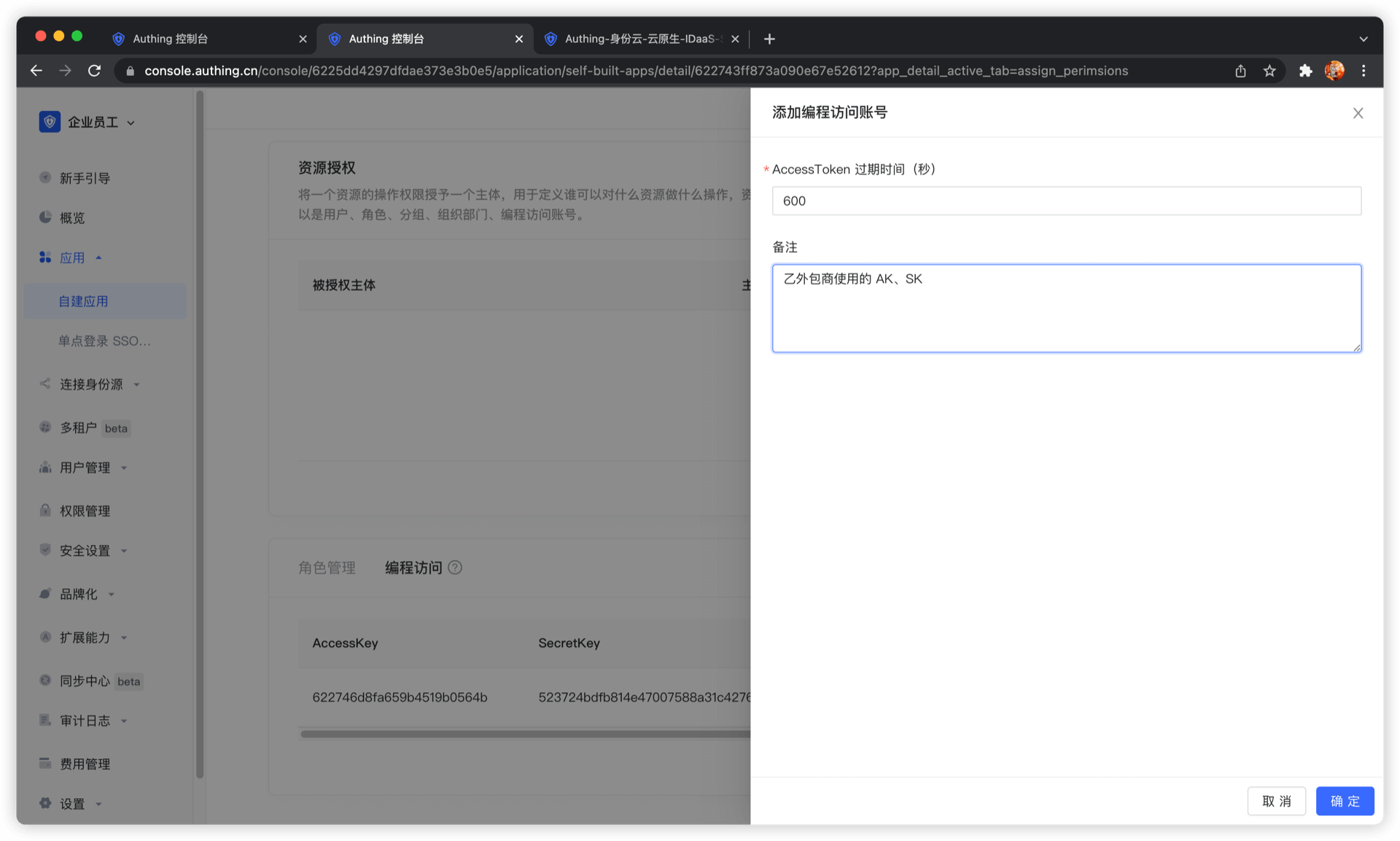 创建两个编程访问账号,填写 AccessToken 过期时间和备注信息,点击确定。