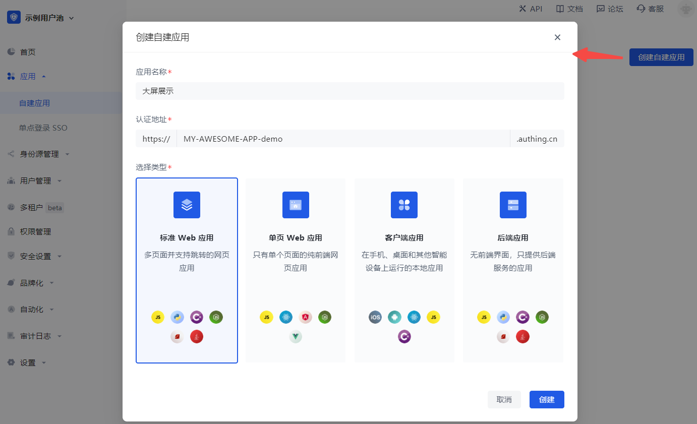 在 Authing 创建一个应用,叫做「大屏展示」。