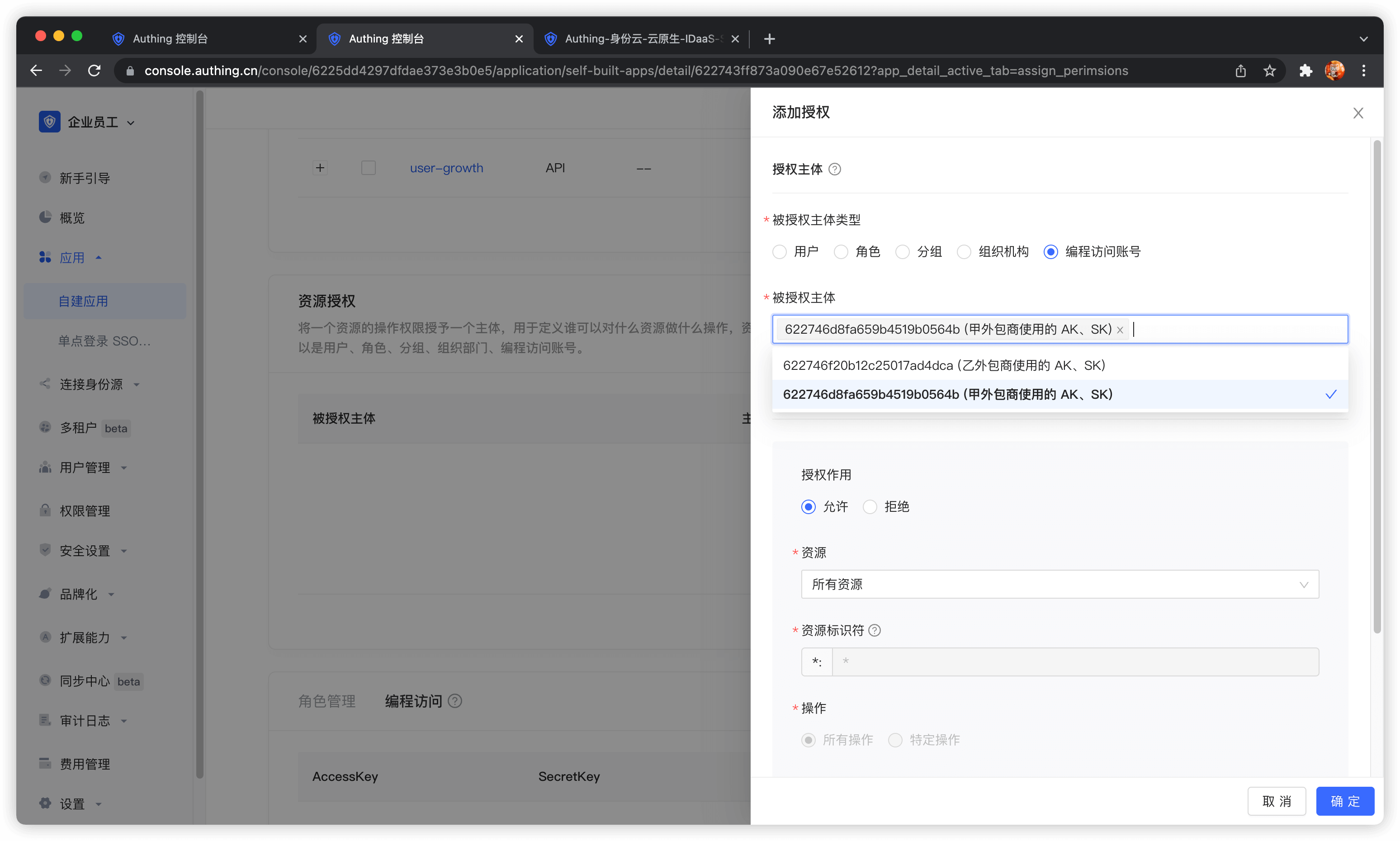 被授权主体类型选择编程访问账号,然后选择甲外包公司的编程访问账号账号。