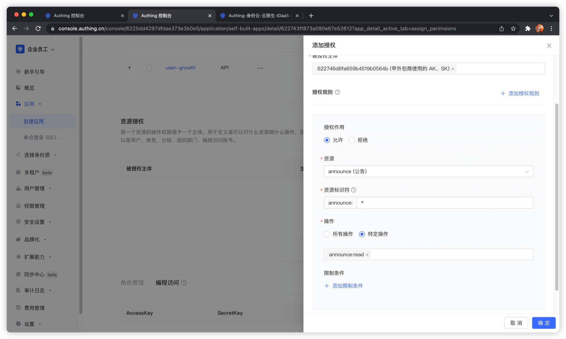 授权规则中,资源类型选择公告信息,资源标识符填写 * 代表授权所有公告资源,操作选择特定操作,然后选择 announce:read 操作。最后点击确定。这条规则的作用是:将所有公告信息资源的读取权限授权给甲外包公司。