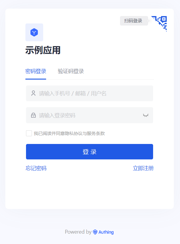 在弹出的新窗口中,你可以看到这个 Authing 托管在线登录页 (opens new window),该登录页集成了登录、注册、忘记密码、社交登录、MFA 等功能: