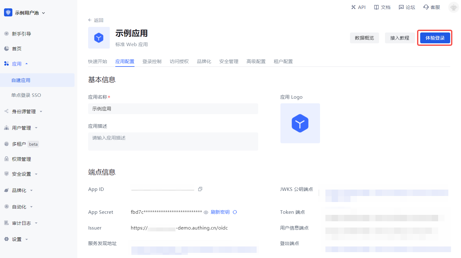 应用创建成功后,点击右侧的 体验登录 按钮体验登录该应用:
