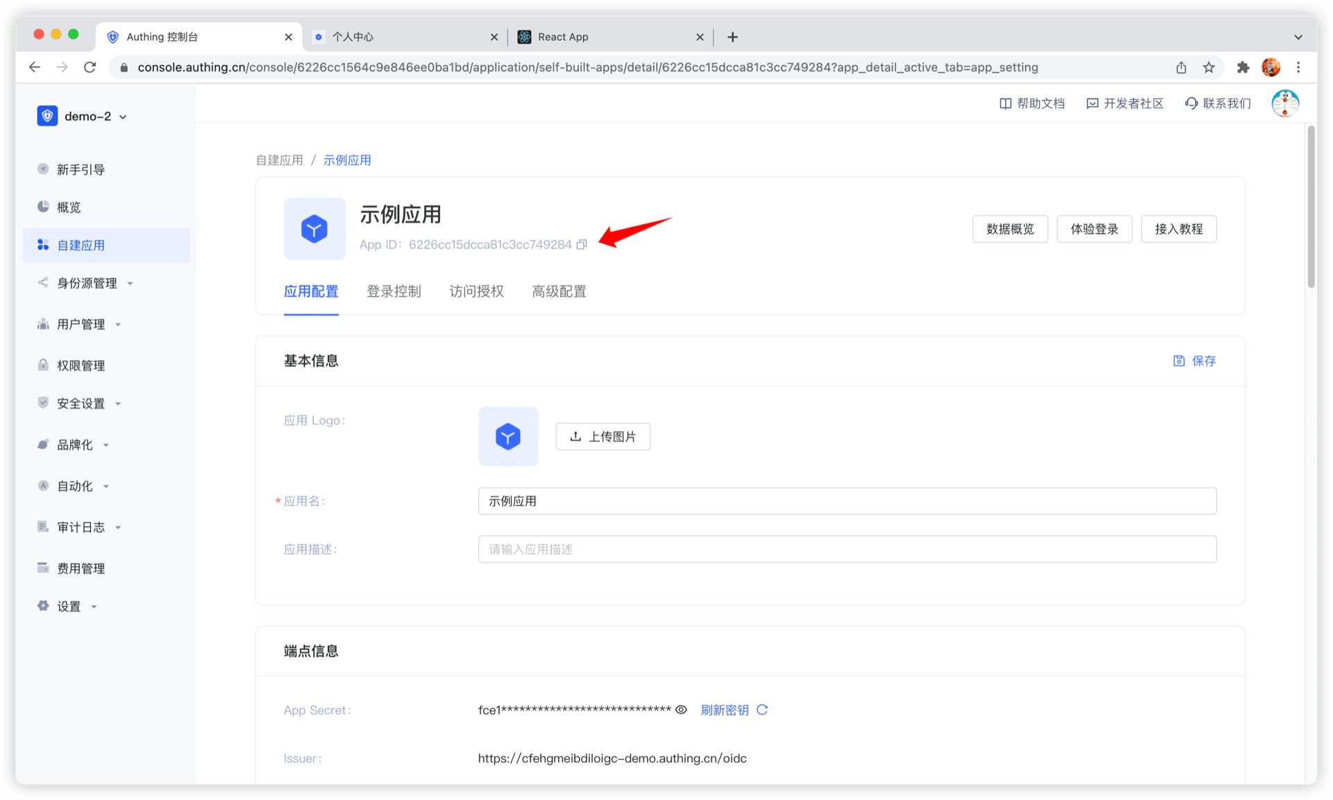 登录 Authing 后,Authing 会为你创建一个默认用户池和应用,你也可以自己创建应用,在应用详情中,可以获取应用 ID,点击复制按钮复制即可: