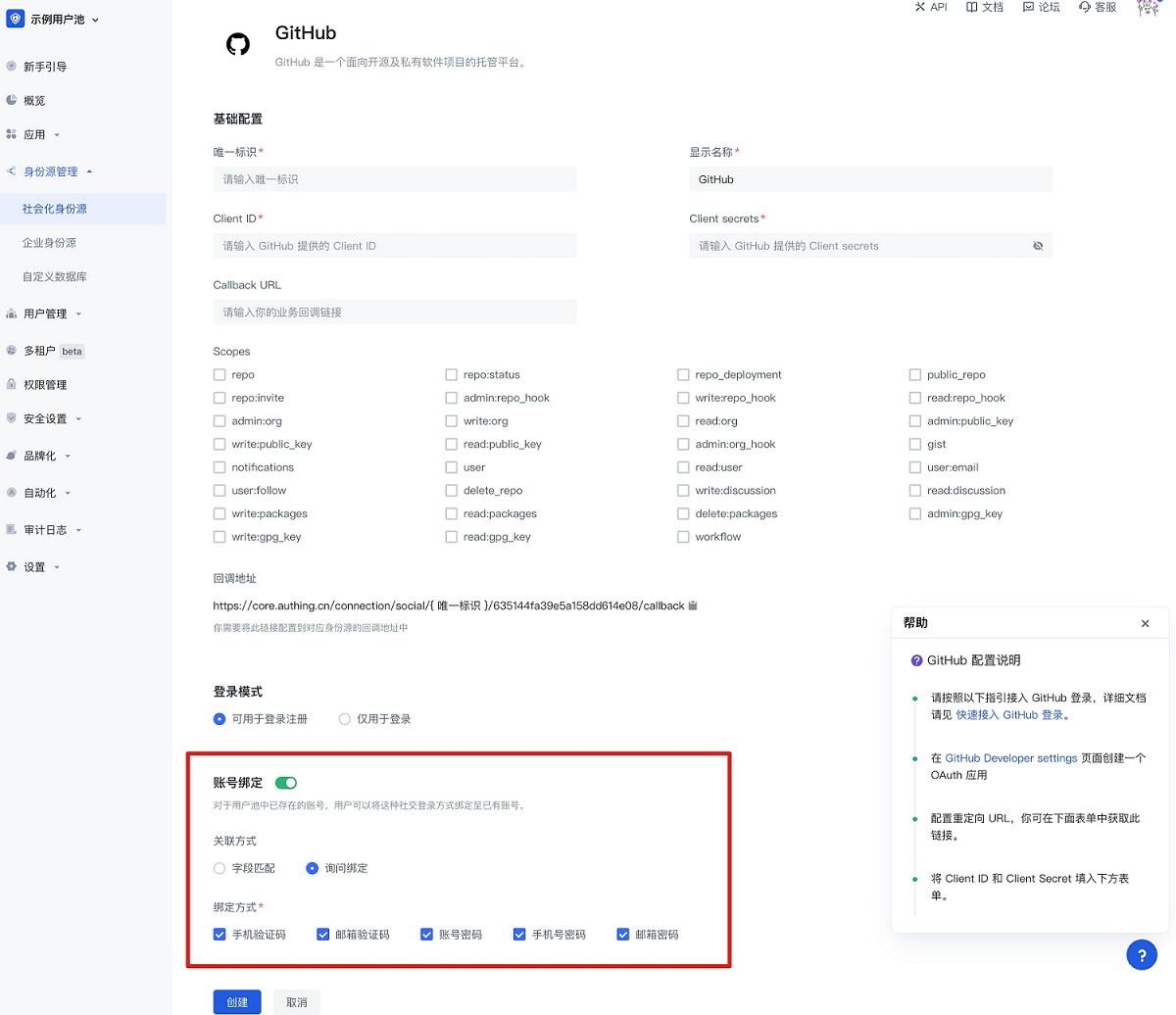 - 在你要使用的身份源配置区找到「账号绑定」,并打开开关