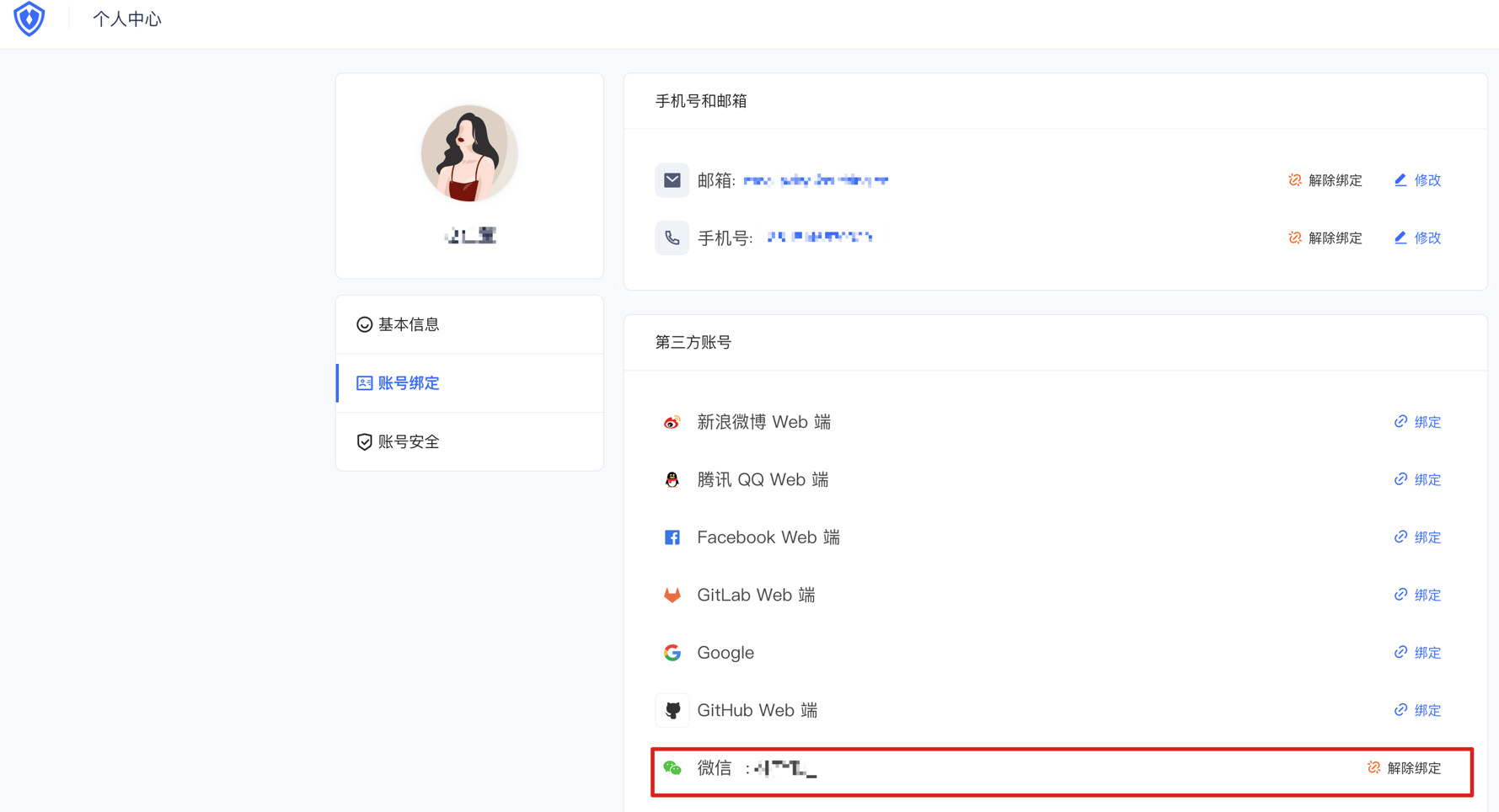 除了在登录时绑定账号之外,你的用户也可以直接在**个人中心 (opens new window)**(无论你使用的是 Authing 的个人中心或者使用你独立开发的个人中心)进行第三方账号的绑定(也可以自行解绑)。完成绑定后,即可以通过任何一种登录方式(常规的账号密码、第三方账号)登录至同一个账号。