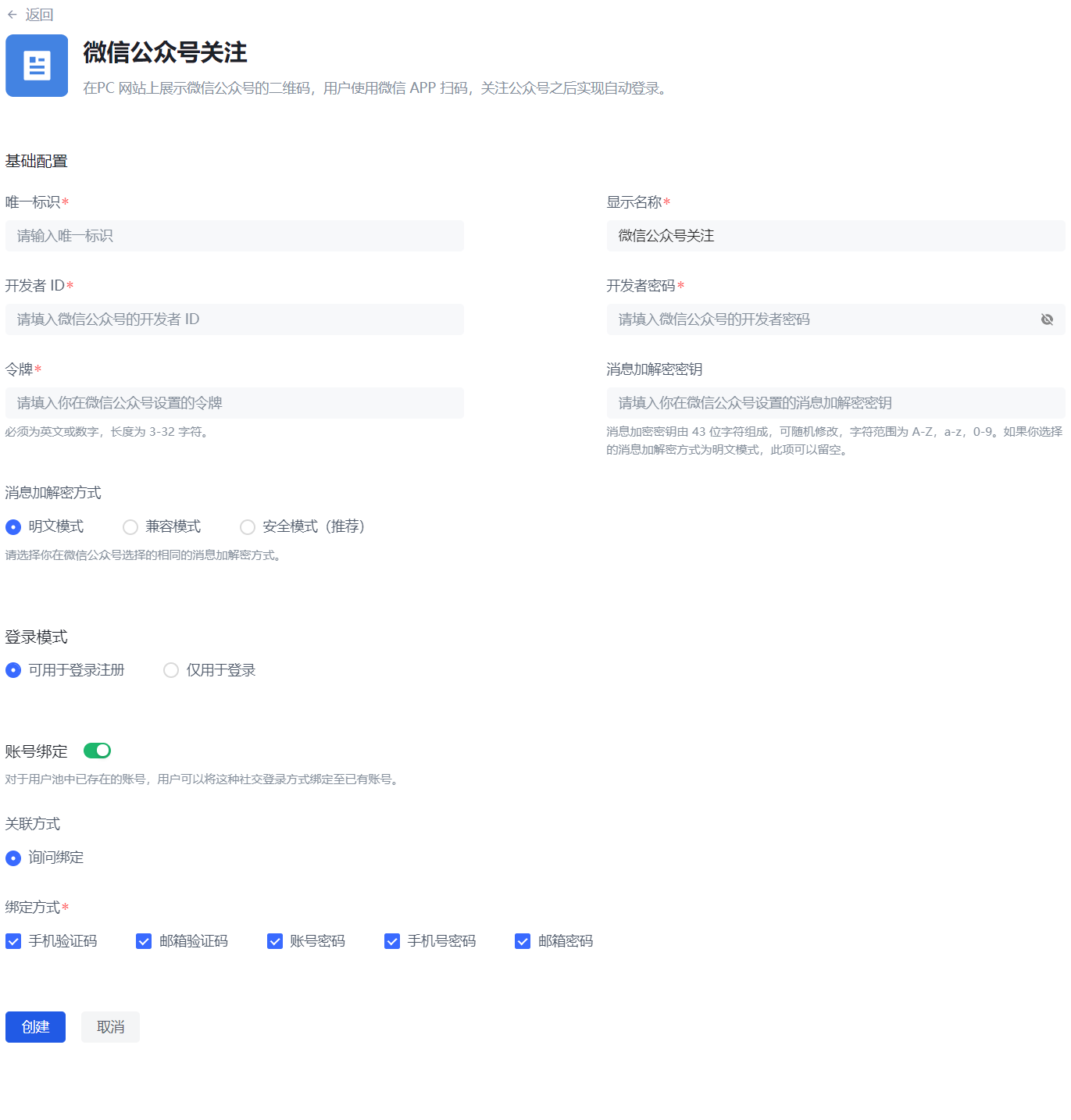 - 选择支持进行绑定的方式(手机验证码、邮箱验证码、账号密码、手机号密码、邮箱密码)