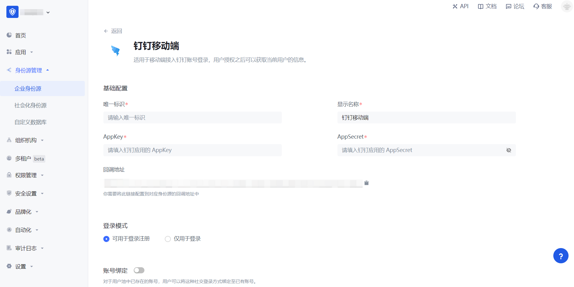 | 账号身份关联 | 不开启「账号身份关联」时,用户通过身份源登录时默认创建新用户。开启「账号身份关联」后,可以允许用户通过「字段匹配」或「询问绑定」的方式直接登录到已有的账号。 |