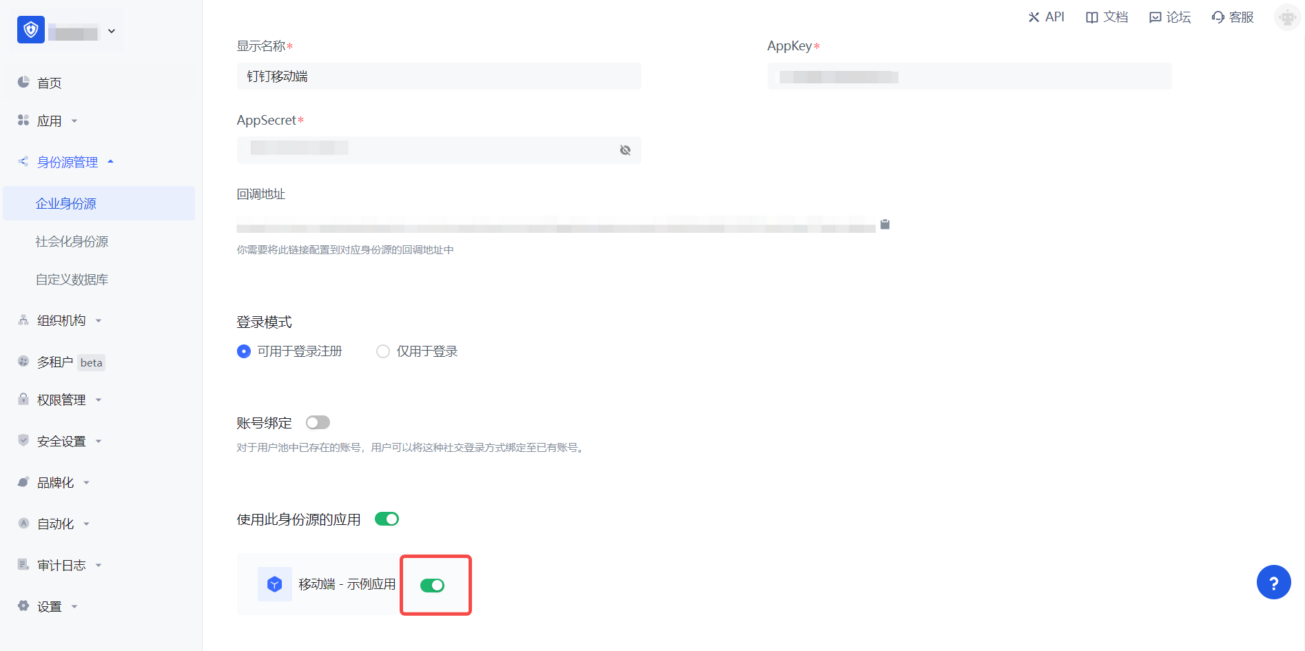 3.2 在已创建好的钉钉移动端身份源连接详情页面,开启并关联一个在 Authing 控制台创建的应用