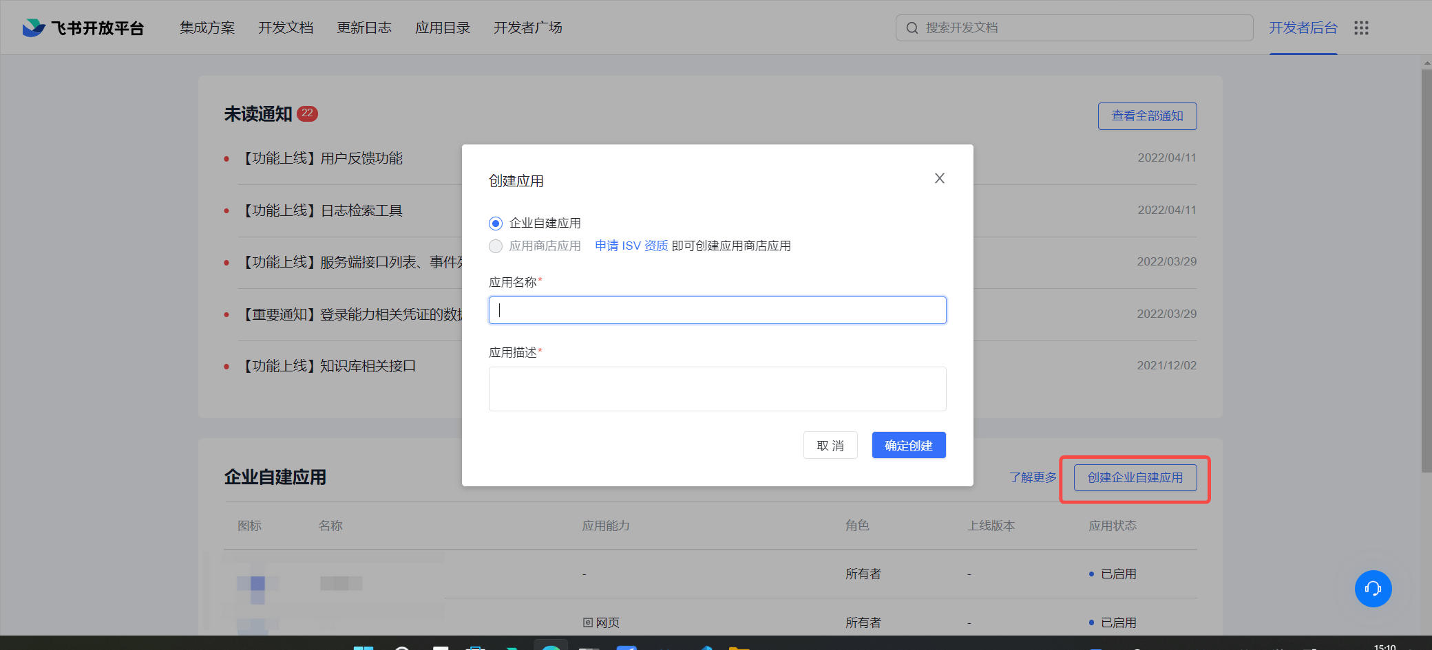 前往 飞书开发者后台 (opens new window),点击创建企业自建应用,填写相应内容,创建应用。