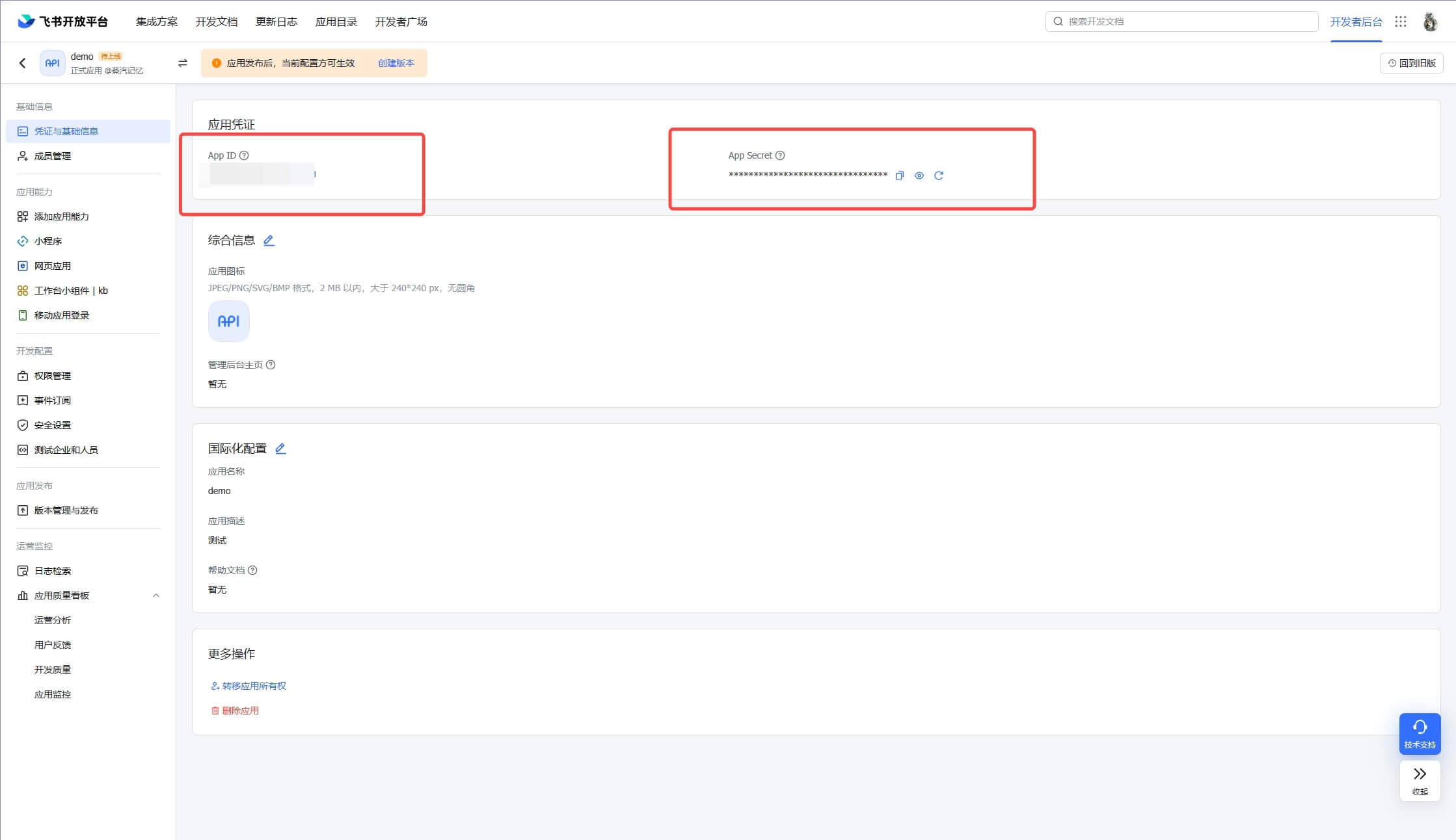 App ID 和 App Secret ,填写在飞书应用的后台, 凭证与基础信息 中的 App ID 和 App Secret 。