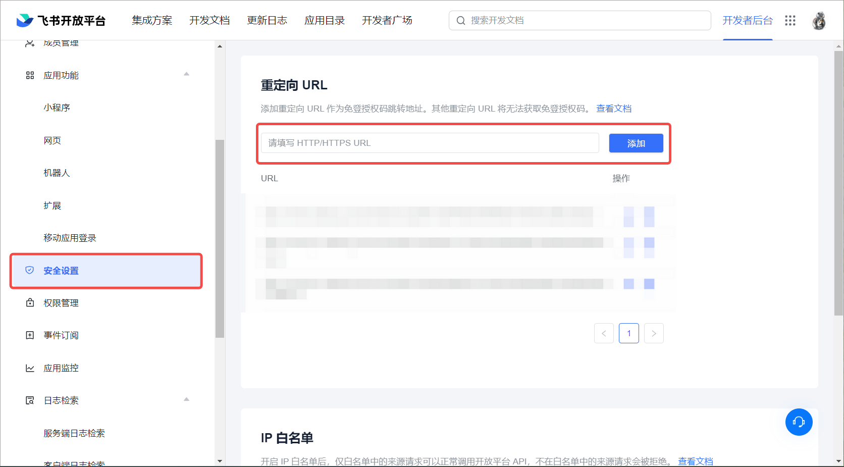 在飞书开发者后台,打开应用管理页面,选择安全设置,将 Authing 后台的 回调地址,添加到 重定向 URL 中