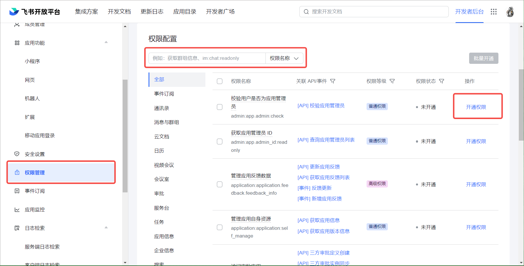 为了能够正常获取到飞书的用户信息,完成认证流程,需要在权限管理页面,完成权限配置,搜索以下权限,并开启: