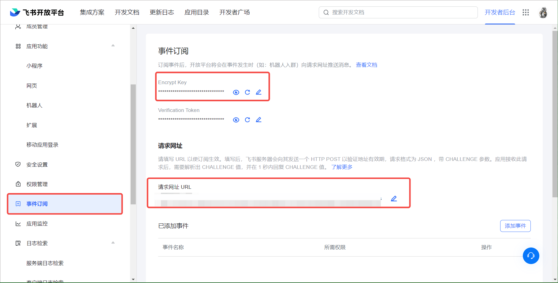 在飞书应用详情的事件订阅页面,配置事件订阅;