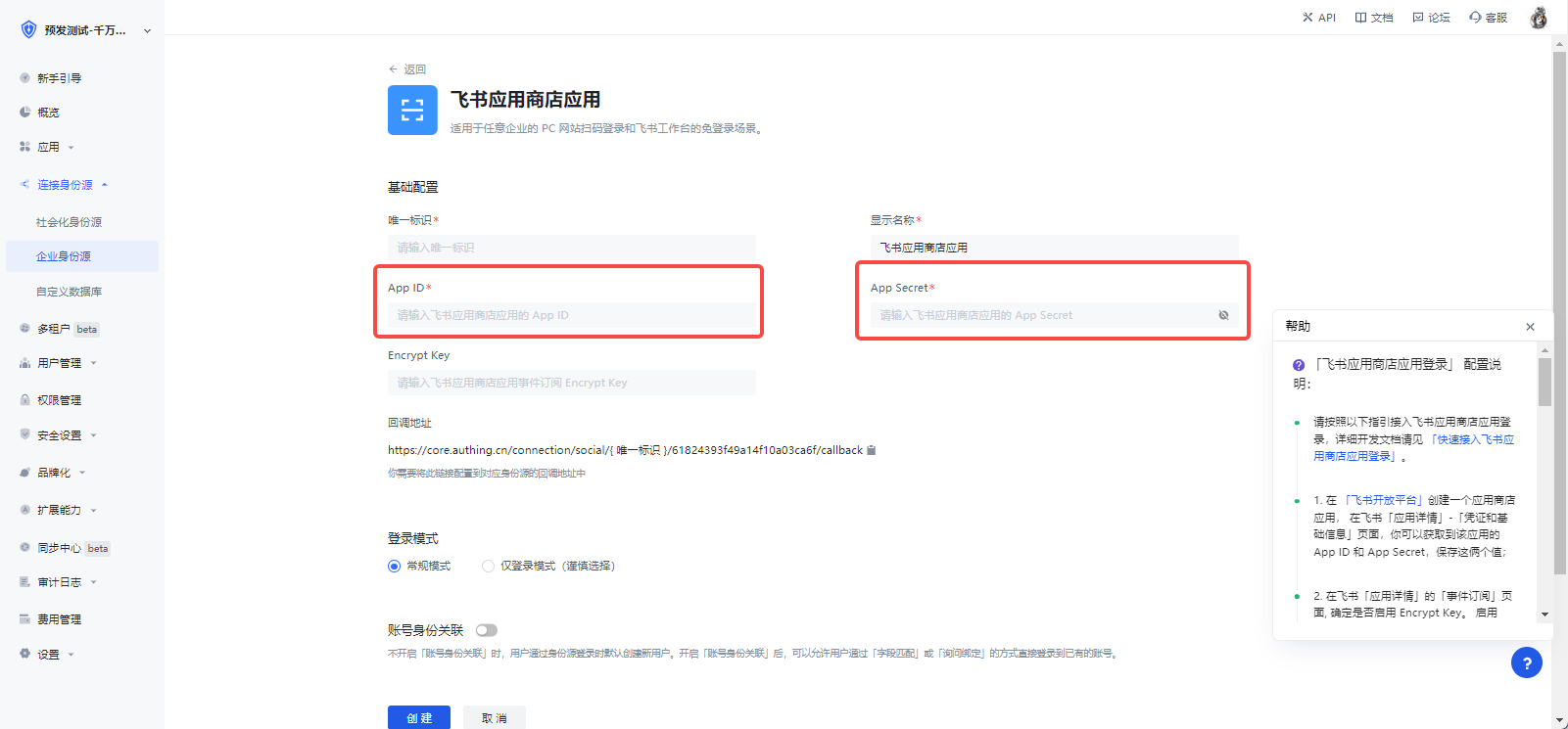 ¶ 第二步:在 Authing 控制台配置 飞书应用商店应用