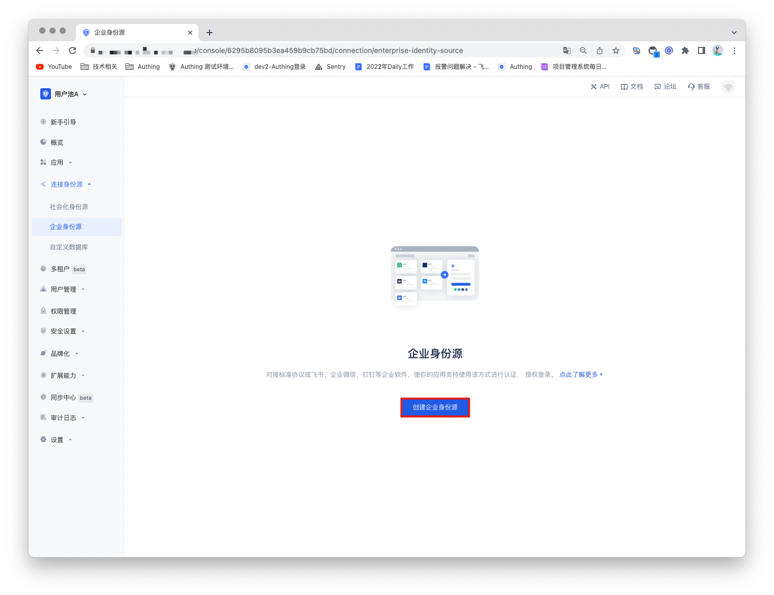 2.1 打开 Authing 控制台,进入想要连接 LDAP 身份源的用户池,这里称其为 「用户池 B」。在左侧菜单中选择 「连接身份源」 > 「企业身份源」,在右侧面板选择「创建企业身份源」。