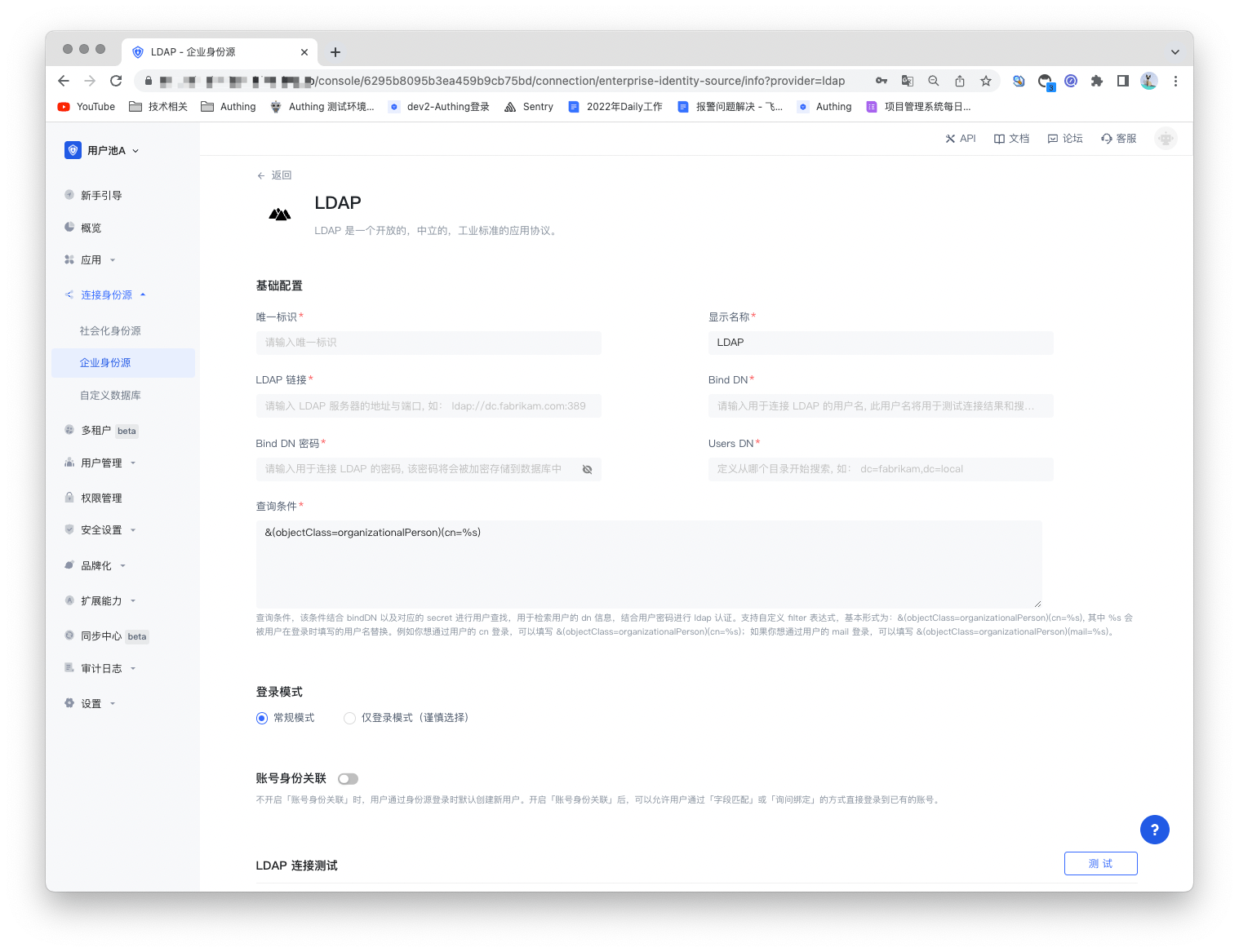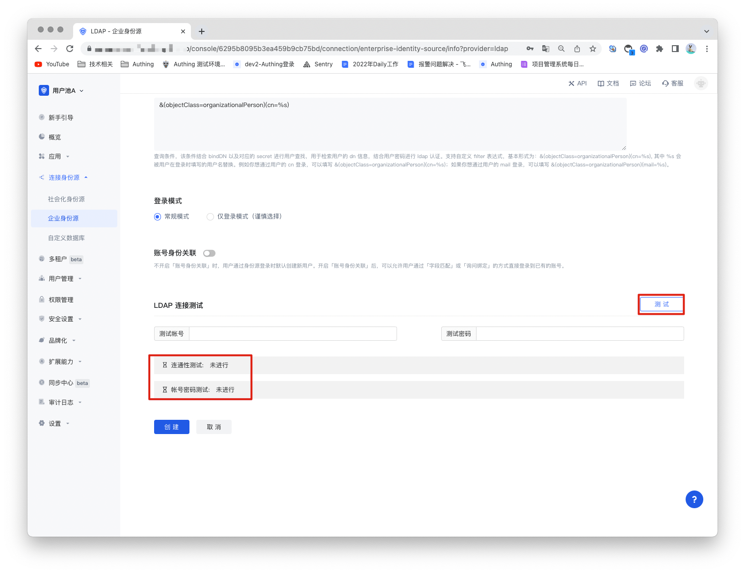 Authing 也提供对 LDAP 连接的测试,测试 LDAP 服务的连通性和账号密码是否正确,帮助你检查参数是否填写正确了。
