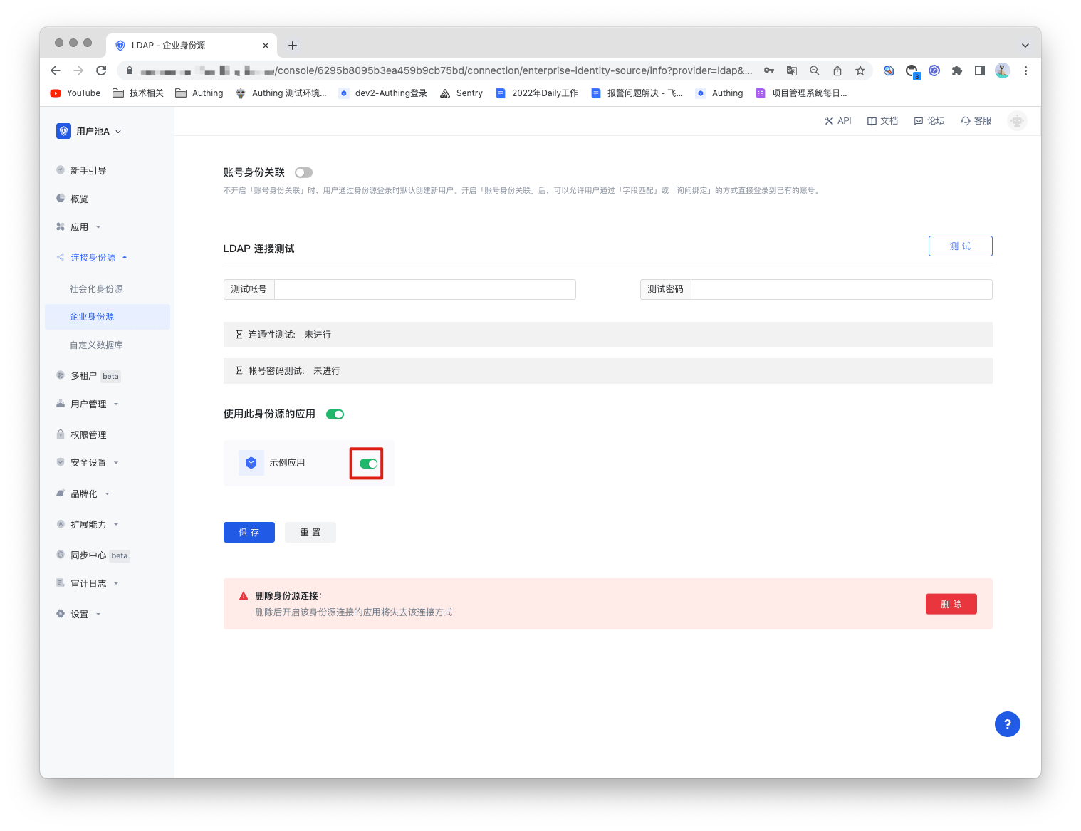 3.2 在已创建好的 LDAP 身份源连接详情页面,开启并关联一个在 Authing 控制台创建的应用。