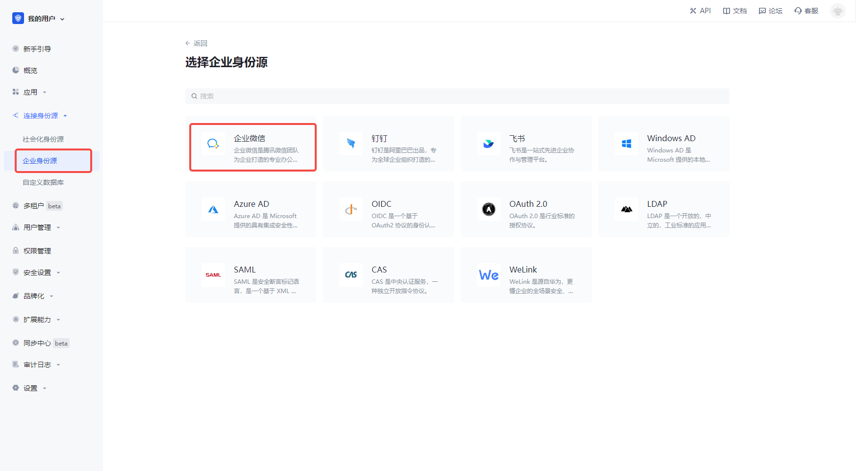 2.1 请在 Authing Console 控制台 的「企业身份源」页面,点击「创建企业身份源」按钮,进入「选择企业身份源」页面,点击「企业微信」身份源按钮