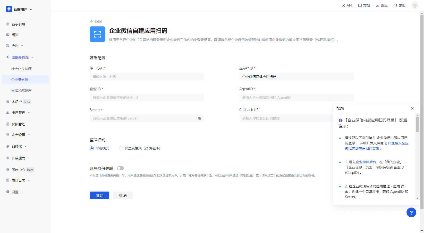 2.3 请在「企业微信自建应用扫码」页面,填写相关的字段信息。