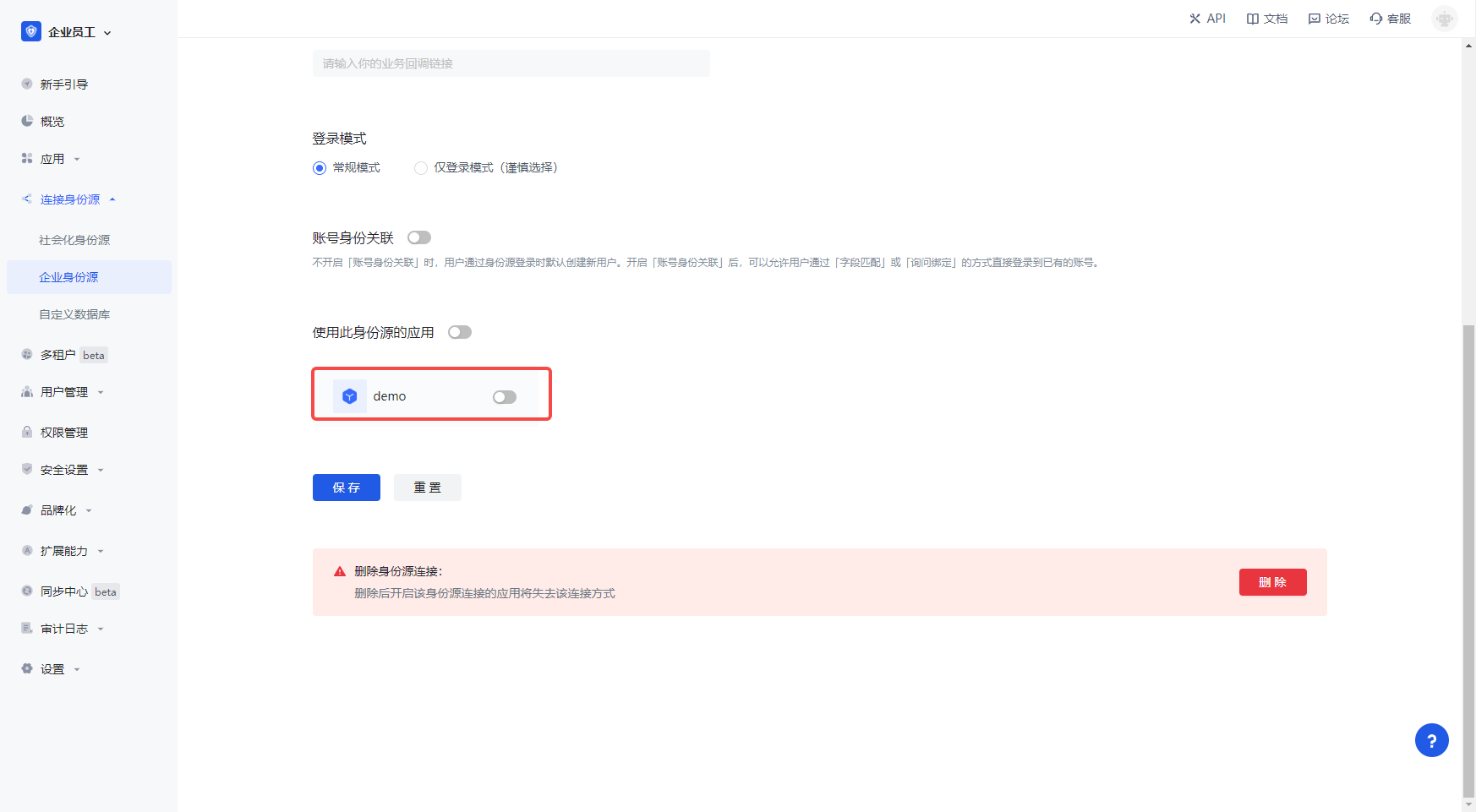 | 登录模式 | 开启「仅登录模式」后,只能登录既有账号,不能创建新账号,请谨慎选择。 |