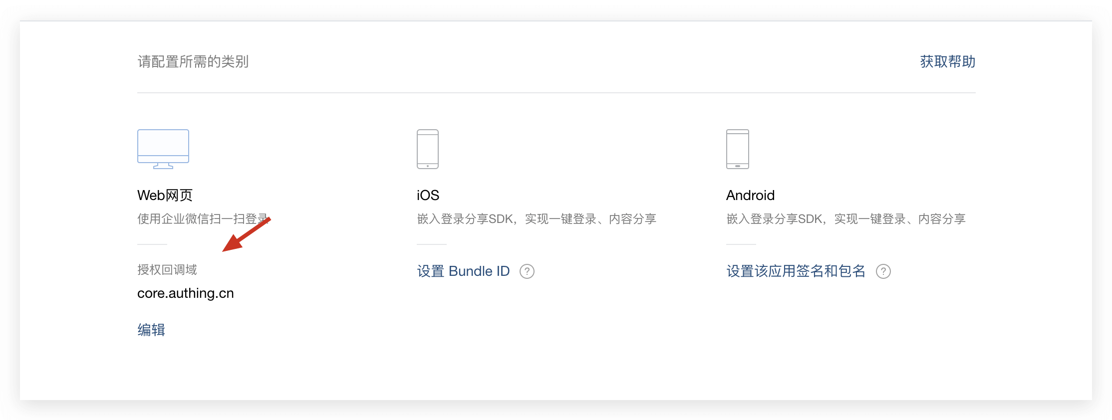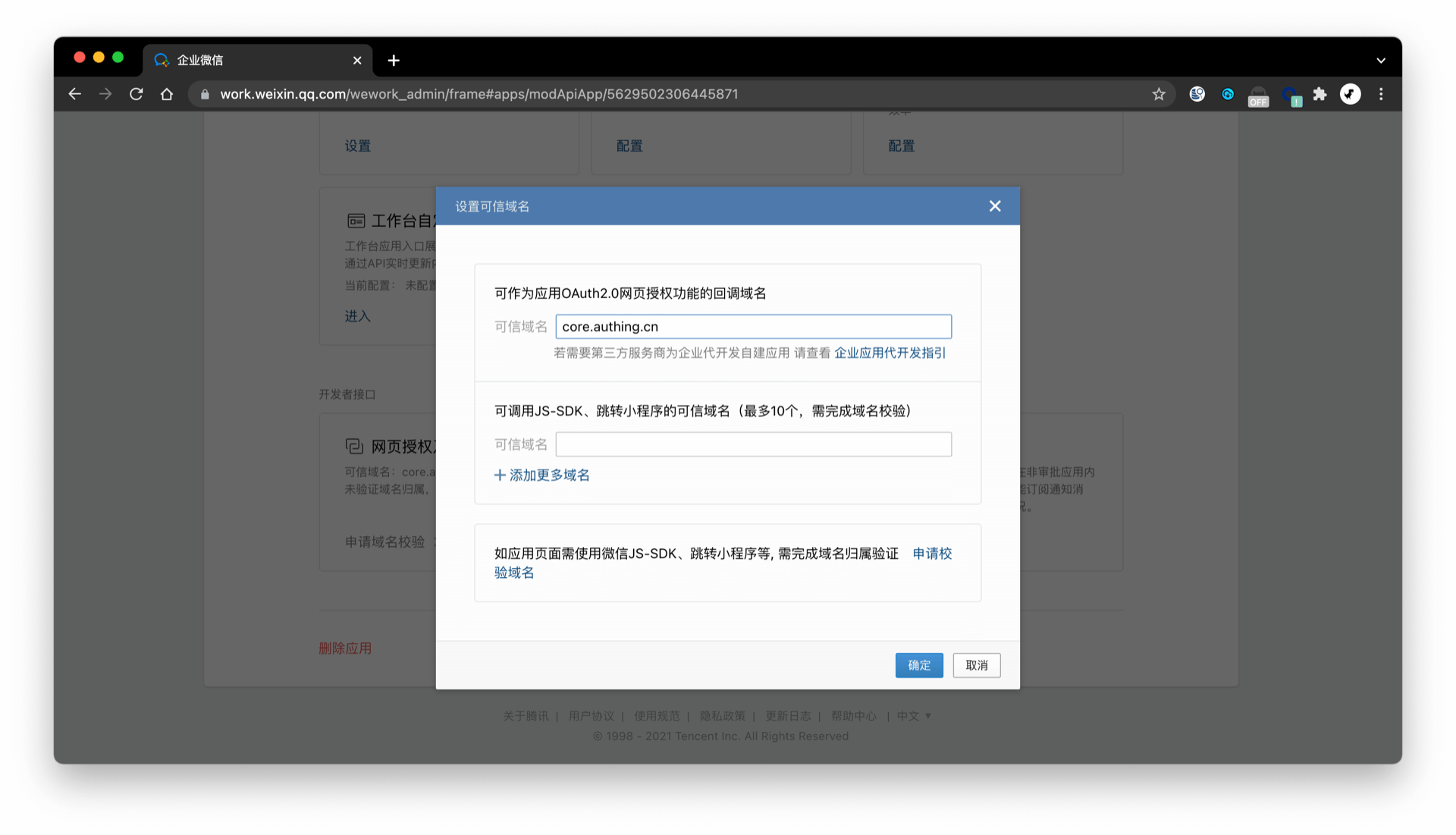 创建完成后,进入应用详情页,设置网页授权及 JS-SDK 域名,域名地址填写 core.authing.cn