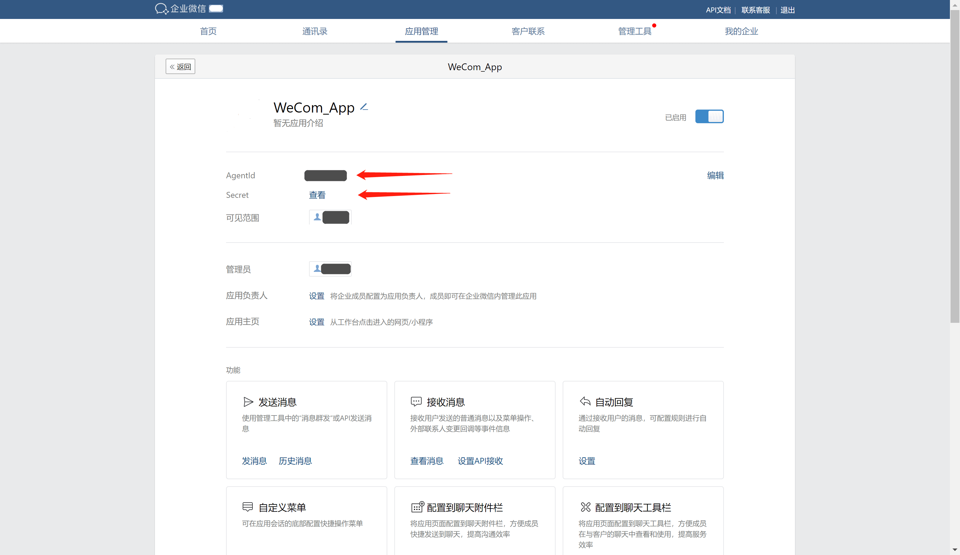 在应用详情页,可以获取该应用的 AgentId 和 Secret:
