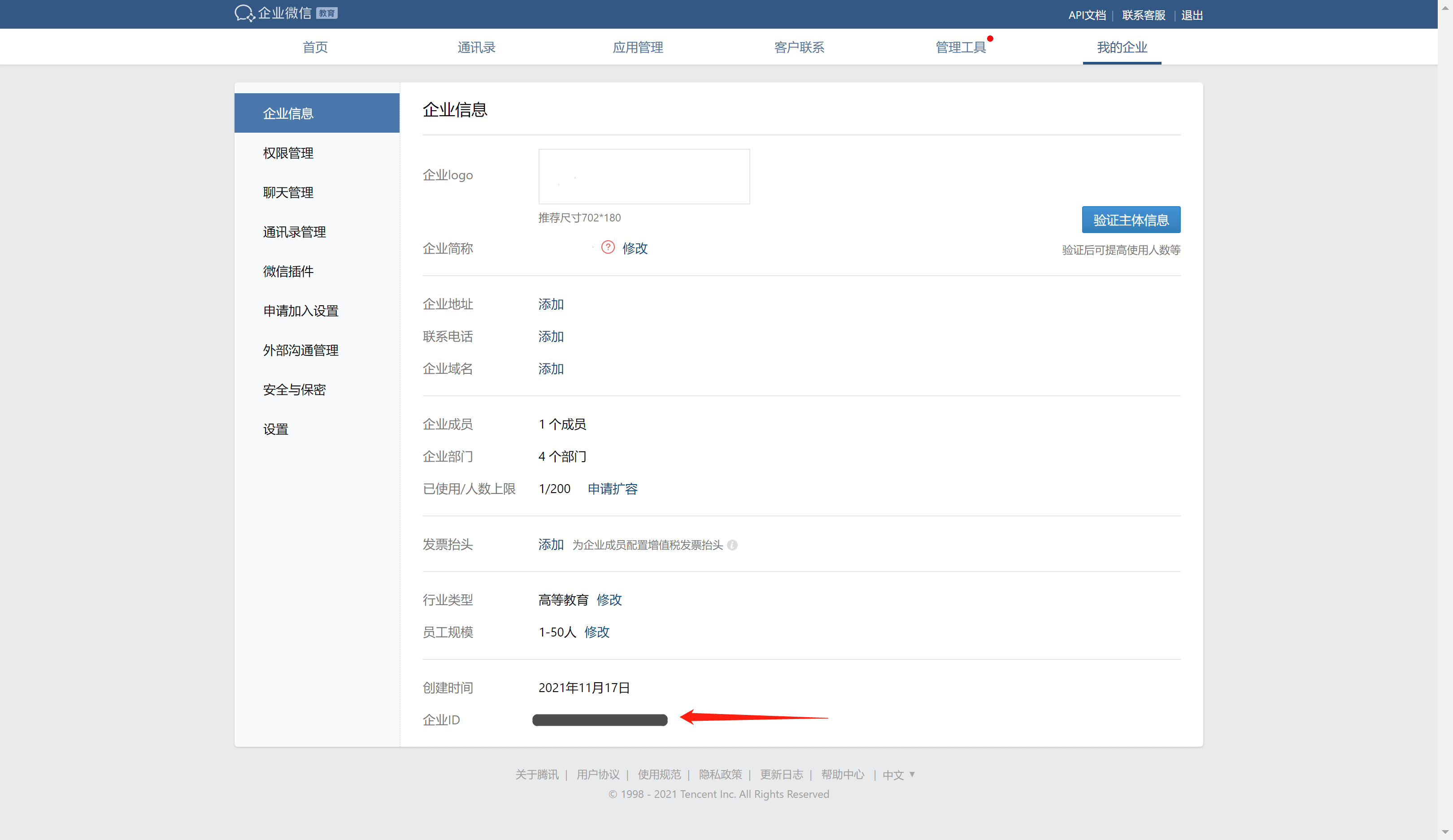 在我的企业 - 企业信息页面,可以获取企业 ID。