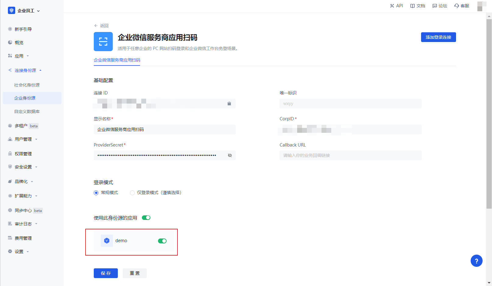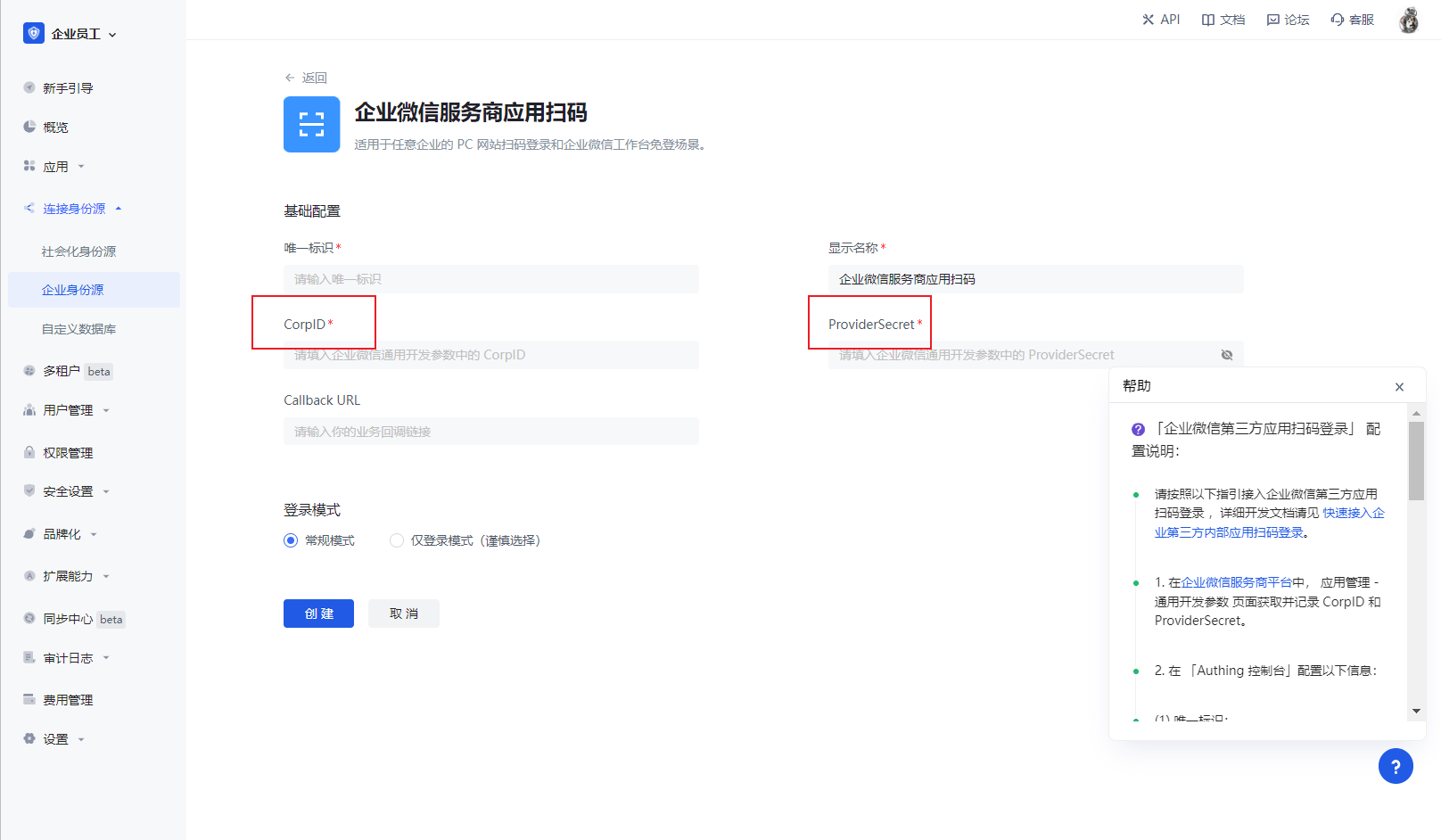2.3 请在 Authing Console 控制台 的「企业身份源」-「企业微信服务商应用扫码」页面,配置相关的字段信息。