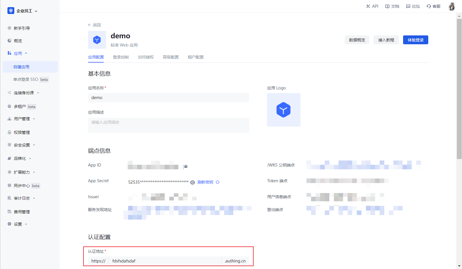 3.4 把从应用详情中认证地址,填写到 微信服务商后台应用管理,登录授权中的登录授权发起域名,授权完成回调域名填写 core.authing.cn